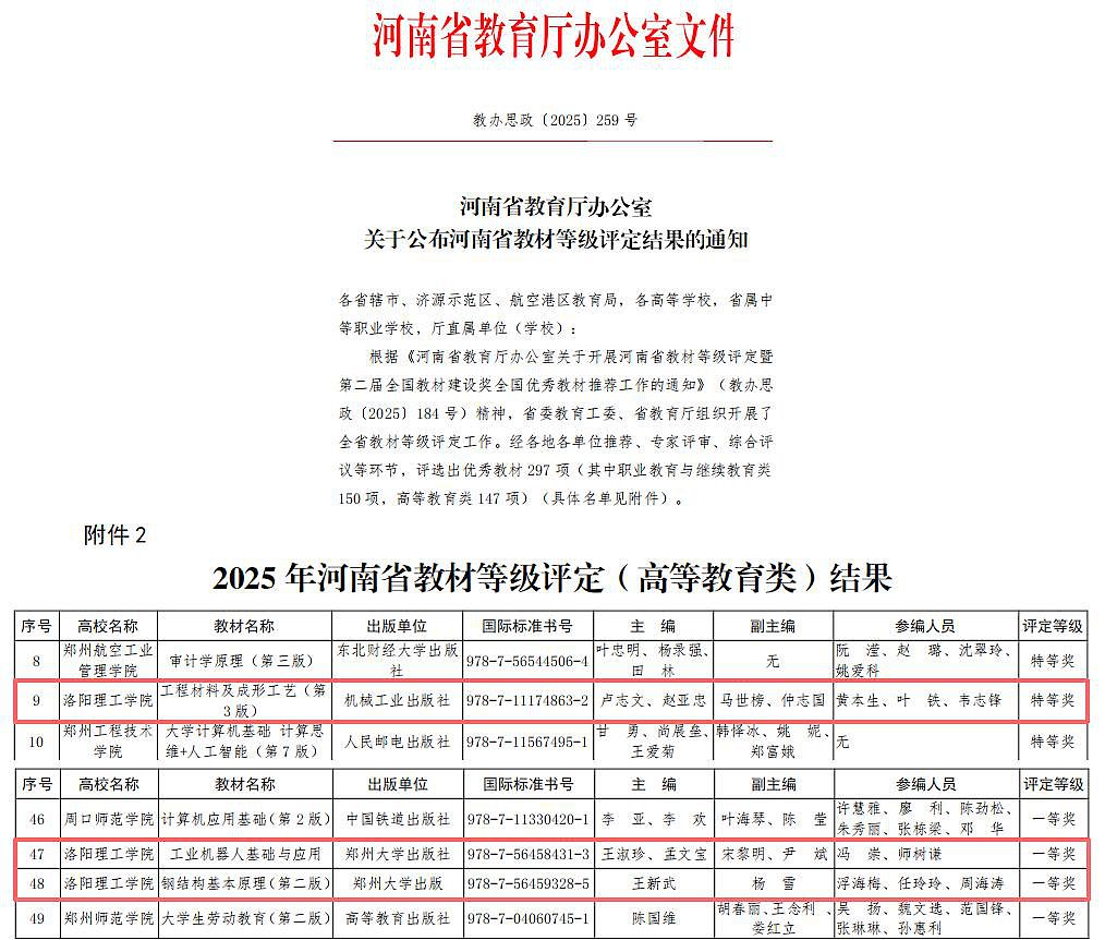 近日,河南省教育厅办公室印发《关于公布河南省教材等级评定结果的通知》(教办思政〔2025〕259号)。我校推荐申报的教材在此次评定中共获特等奖1项、一等奖2项,覆盖机械工程、土木工程、机器人工程等多个学科领域。