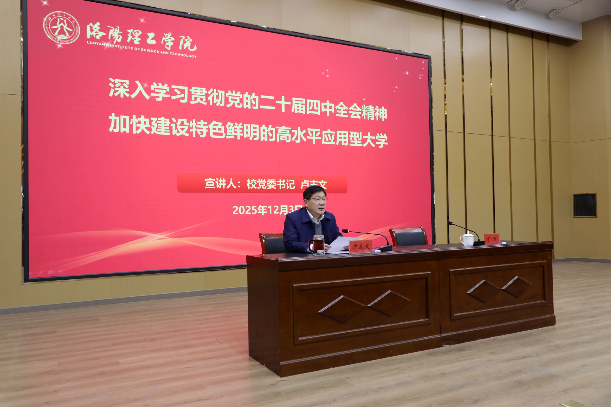 卢志文指出,学习好贯彻好全会精神,是当前和今后一个时期的一项重大政治任务。全体党员领导干部和广大师生要提高政治站位,把学习贯彻全会精神与习近平总书记在河南考察时重要讲话精神结合起来,与习近平总书记关于教育的重要论述结合起来,与建设教育强国战略要求结合起来,认真贯彻落实省委十一届十次全会精神和省委常委、市委书记陈春江同志到校宣讲调研时的讲话精神,聚焦推动高质量发展、高效能治理,坚持学思想、讲协同、抓落实,吃透精神实质、掌握核心要义、把准实践要求,坚定发展信心。要对标对表党中央、省委战略部署,贯彻落实学校第三次党代会精神,按照“1369”发展思路,科学制定学校“十五五”发展规划。要聚焦国家战略需要和地方发展实际,优化学科专业布局,深化产教融合、科教融汇,推动科技创新与产业创新深度融合,培养高素质应用型人才,一体推进教育科技人才发展,加快建设特色鲜明的高水平应用型大学。