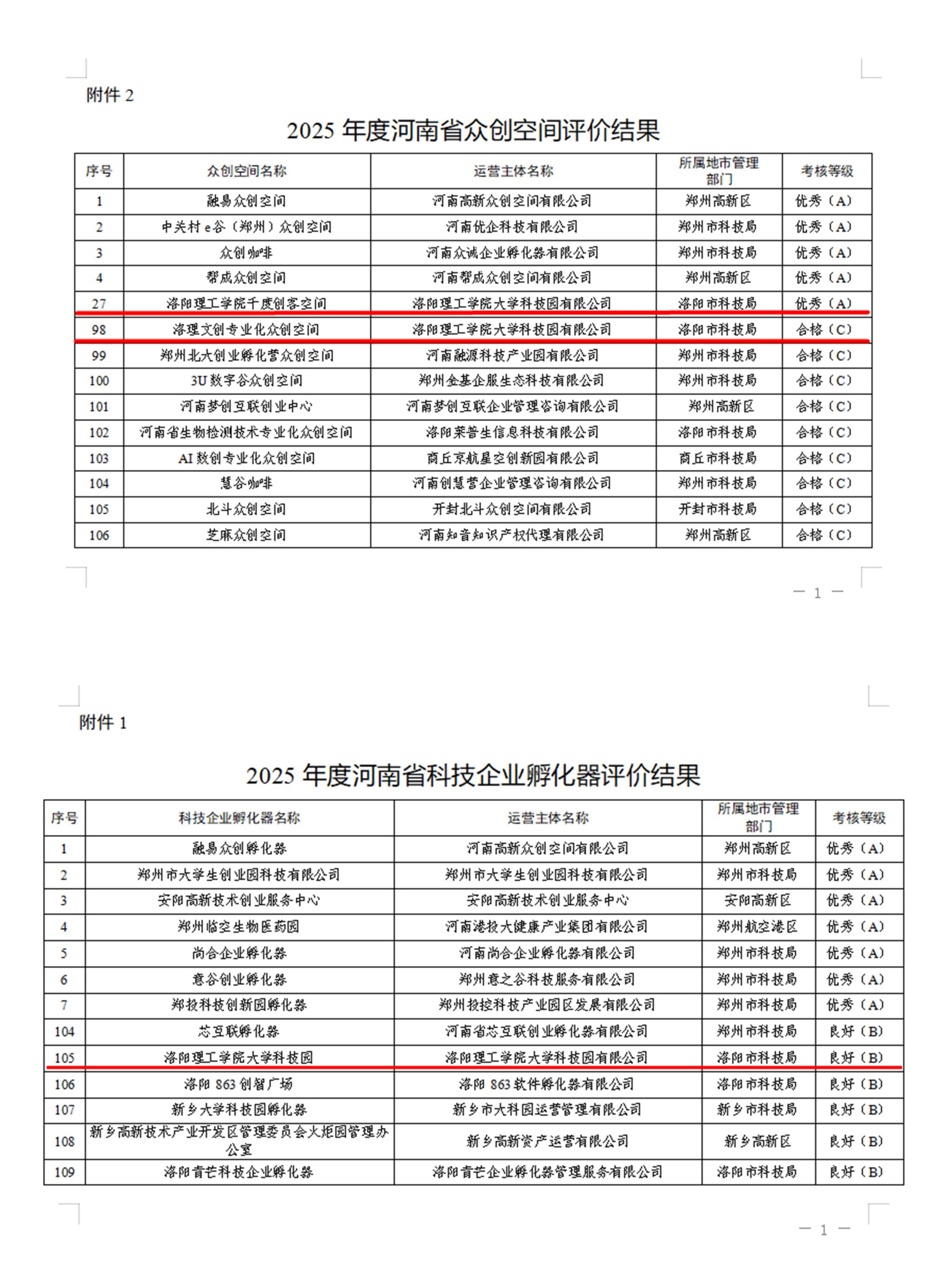 近日,河南省科学技术厅发布《关于公布2025年度河南省科技企业孵化器、众创空间评价结果的通知》,对全省223家省级以上科技企业孵化器、319家省级以上众创空间开展年度综合评价。我校大学科技园孵化载体获佳绩,其中,千度众创空间获评优秀(A)等级,大学科技园孵化器获评良好(B)等级,洛理文创专业化众创空间获评合格(C)等级。