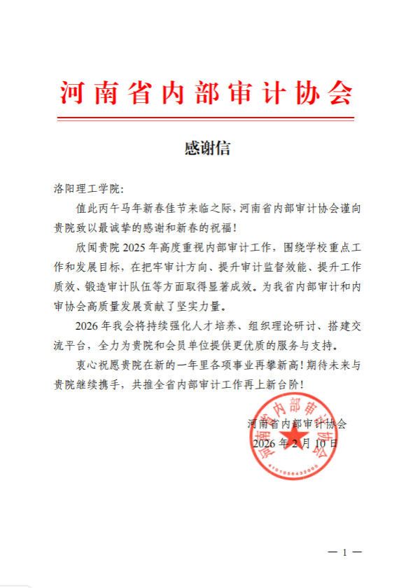 2月10日,河南省内部审计协会向我校发来感谢信,对我校2025年度内部审计工作给予高度评价,并致以新春祝福。