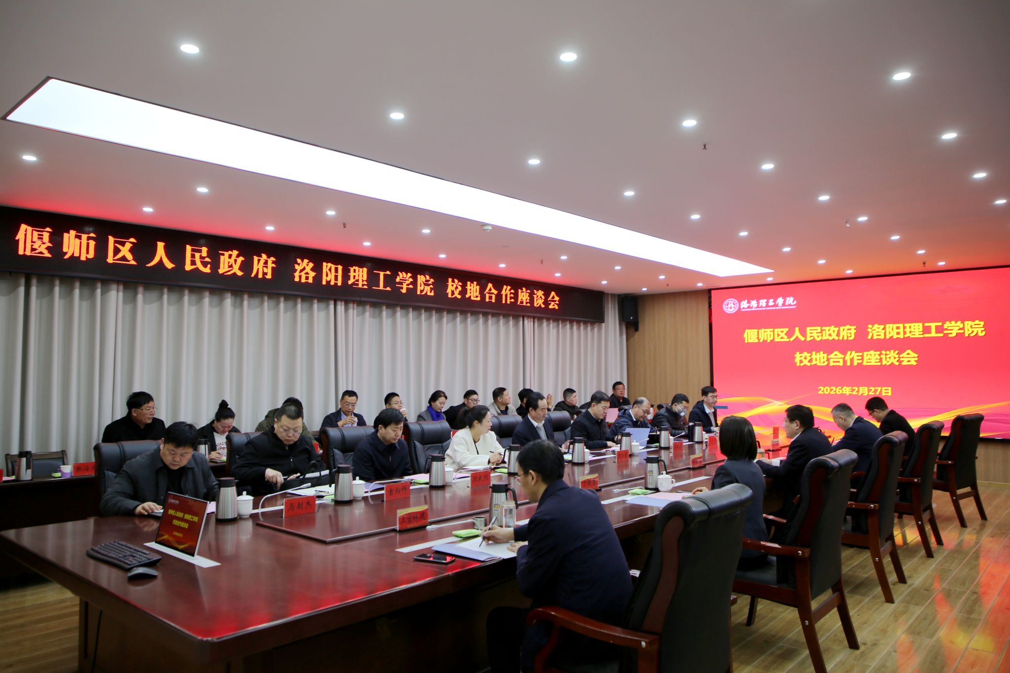 为深化校地合作,共谋融合发展,2月27日上午,我校与偃师区人民政府在王城校区办公楼116会议室举行校地合作座谈会。偃师区委书记彭仁来,区委常委、区委办公室主任苏敬彪,区委常委、宣传部部长、副区长韩静,副区长邱五德,我校党委书记卢志文,校长丁梧秀,党委副书记、工会主席曾涛,副校长上官林建、石念峰出席会议。会议由曾涛主持。