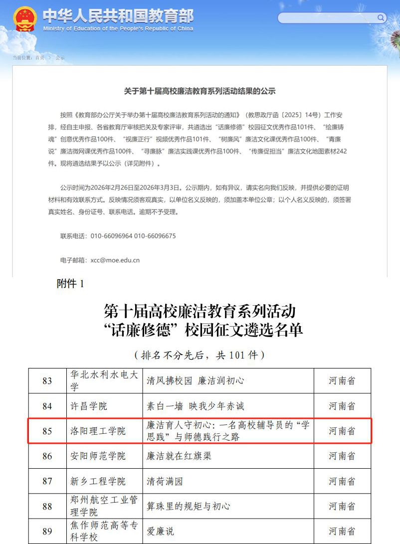 近日,教育部发布《关于第十届高校廉洁教育系列活动结果的公示》,我校人文学院辅导员杨延松撰写的《廉洁育人守初心:一名高校辅导员的“学思践”与师德践行之路》成功入选“话廉修德”校园征文优秀作品名单。