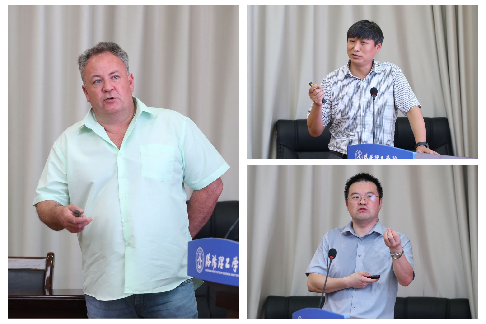 中钢集团洛阳耐火材料研究院有限公司总经理王刚(右上)、河南省科学院先进陶瓷研究所执行所长赵彪(右下)、俄罗斯科斯特罗马国立大学科拉贝尔尼科夫教授(左)分别作学术报告