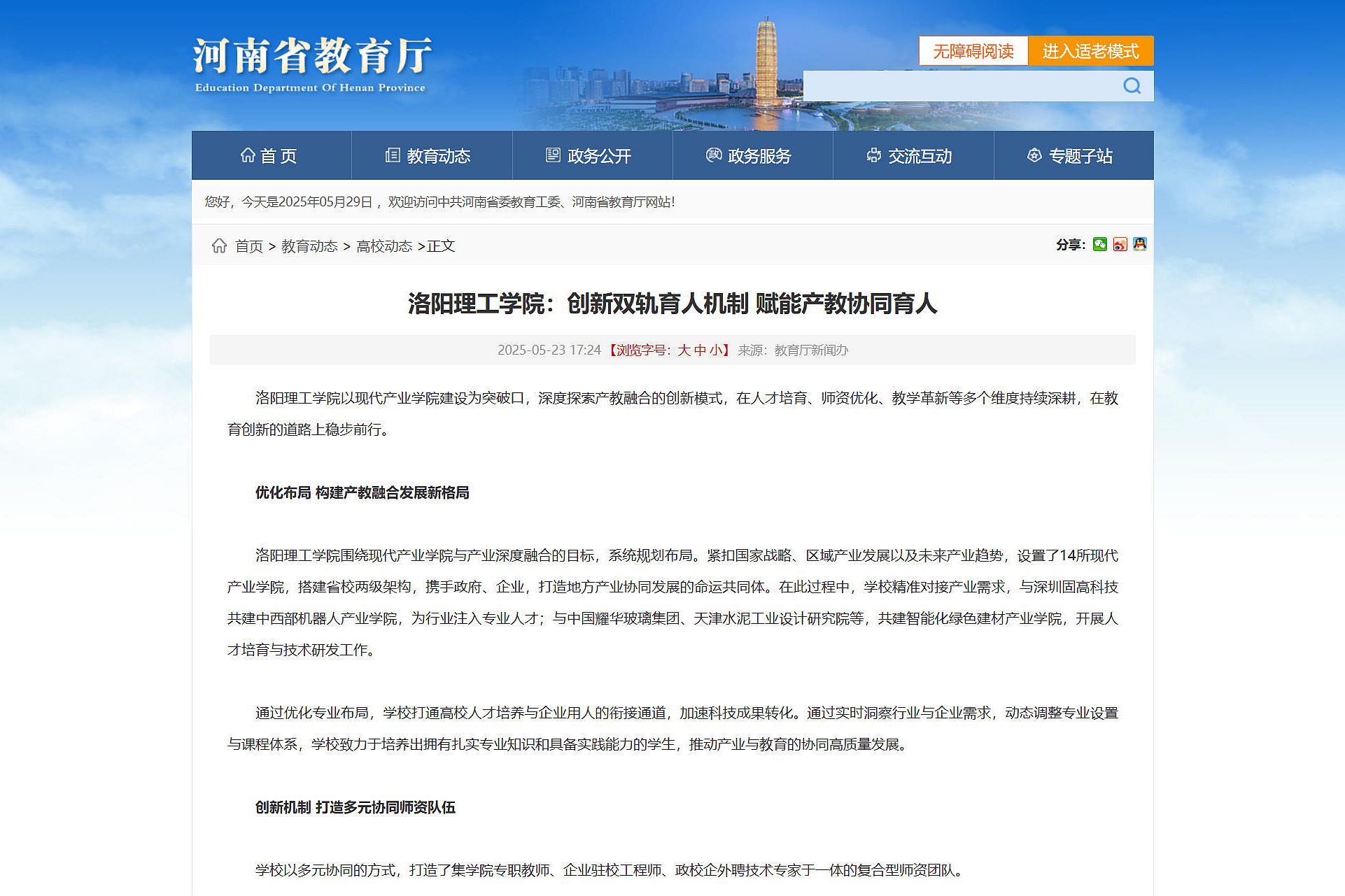 河南省教育厅,2025年5月23日,《洛阳理工学院:创新双轨育人机制 赋能产教协同育人》