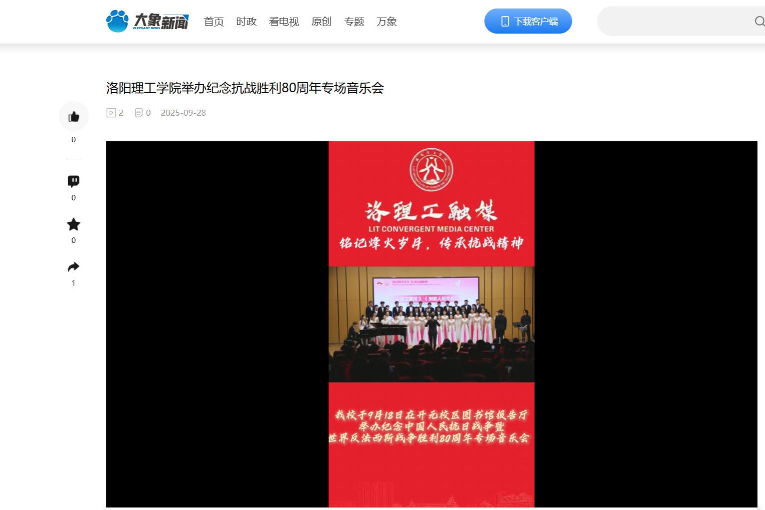 1.大象新闻客户端,2025年9月28日,《洛阳理工学院举办纪念抗战胜利80周年专场音乐会》