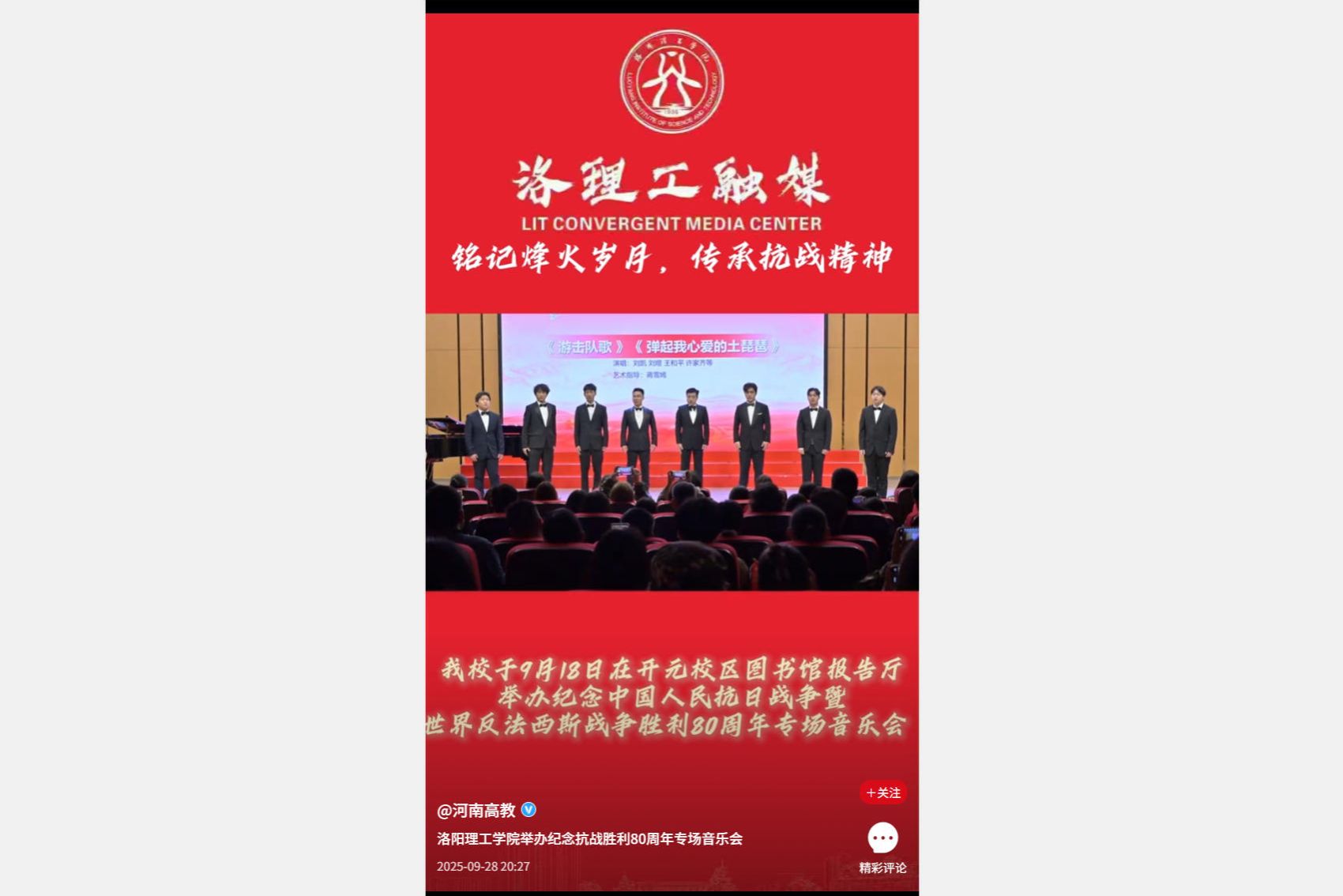 2.顶端新闻客户端,2025年9月28日,《洛阳理工学院举办纪念抗战胜利80周年专场音乐会》