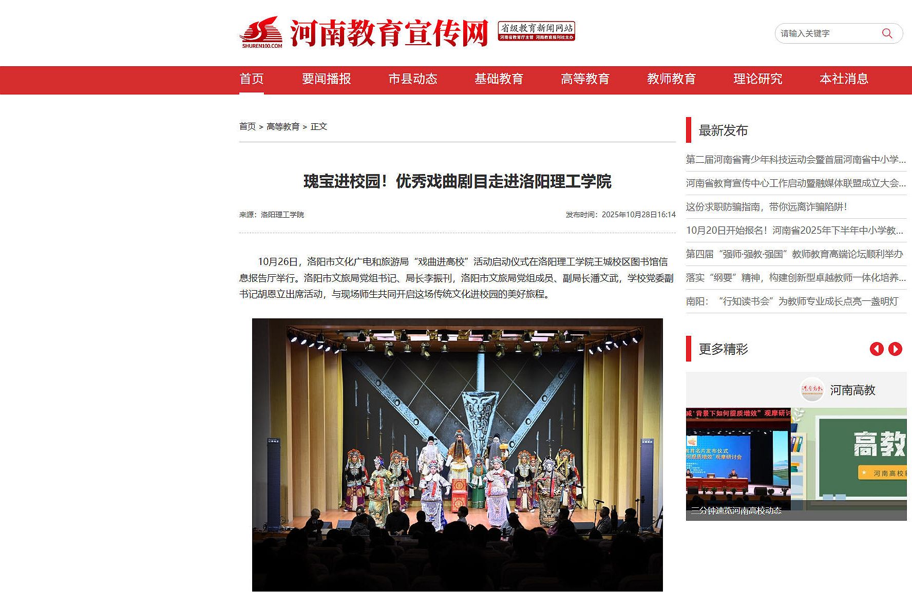 2.河南教育宣传网,2025年10月28日,《瑰宝进校园!优秀戏曲剧目走进洛阳理工学院》