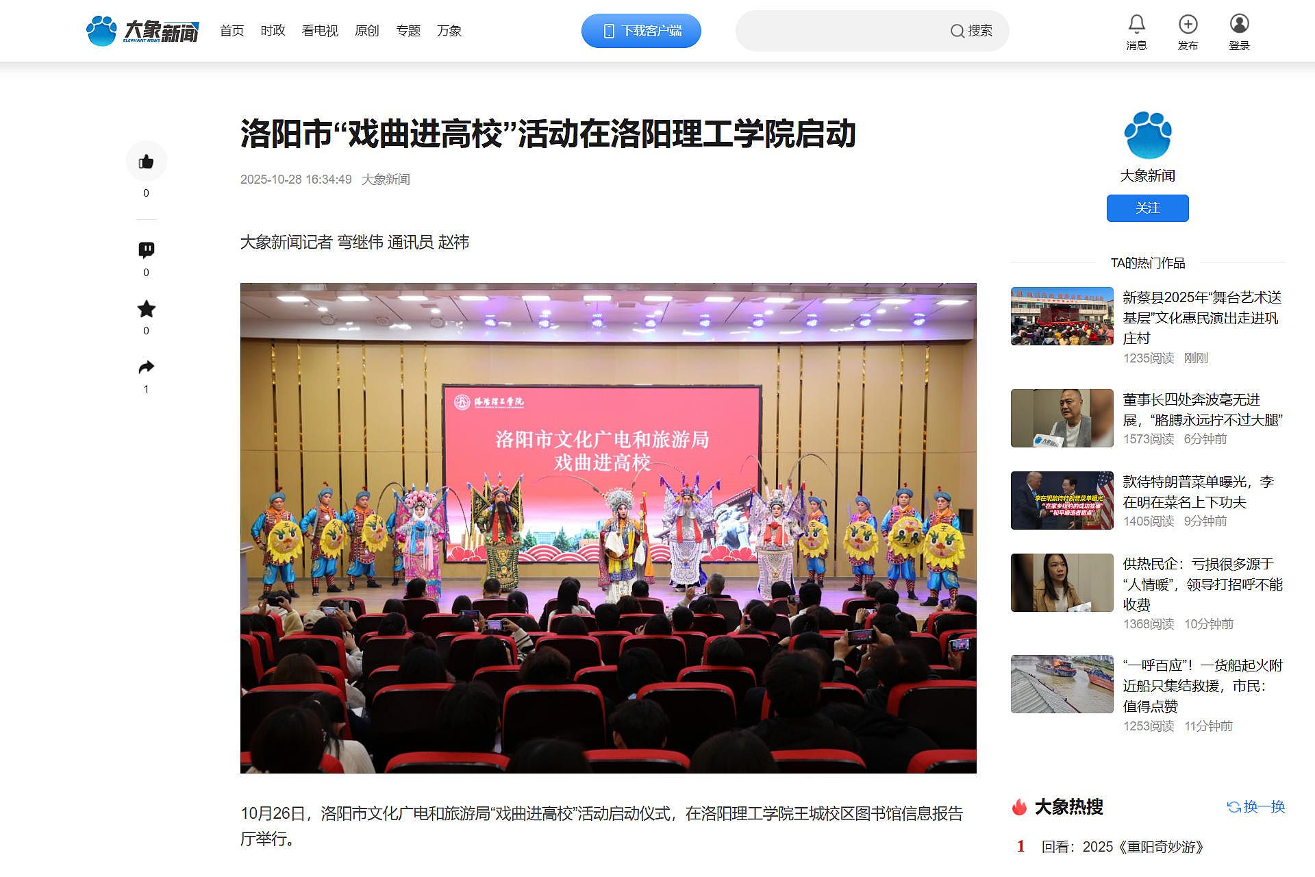 1.大象新闻,2025年10月28日,《洛阳市“戏曲进高校”活动在洛阳理工学院启动》