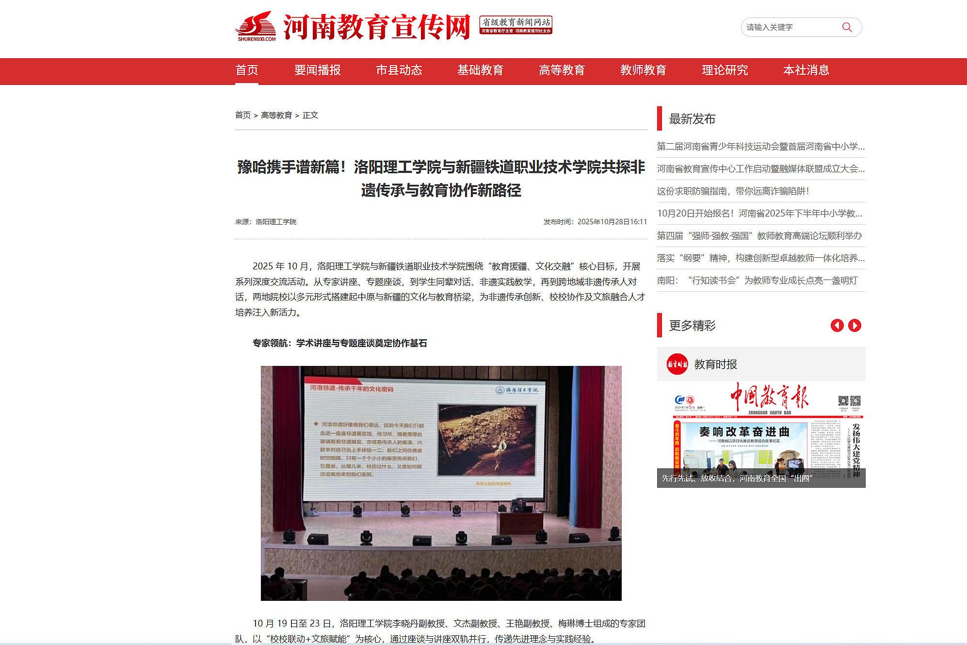 河南教育宣传网,2025年10月28日,《豫哈携手谱新篇!洛阳理工学院与新疆铁道职业技术学院共探非遗传承与教育协作新路径》