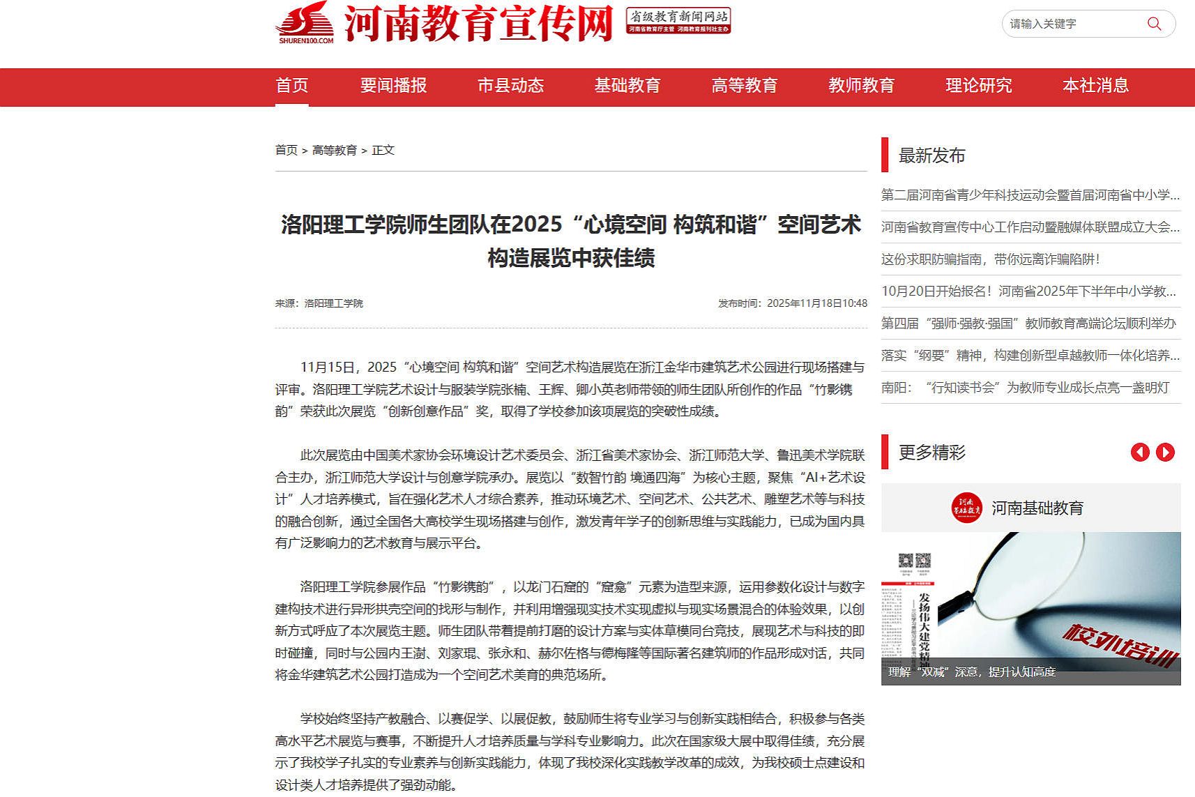 河南教育宣传网,2025年11月18日,《洛阳理工学院师生团队在2025“心境空间 构筑和谐”空间艺术构造展览中获佳绩》