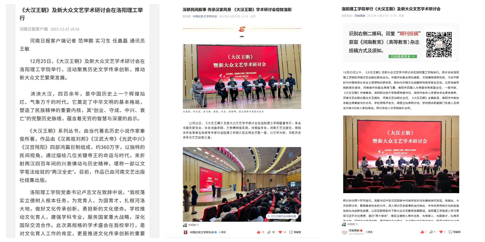 1.《河南日报》客户端,2025年12月25日,《〈大汉王朝〉及新大众文艺学术研讨会在洛阳理工举行》