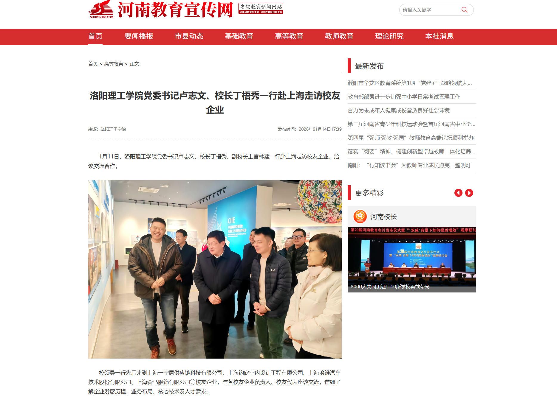1月14日,中国教育之窗、中国高校之窗、河南教育宣传网分别报道我校党委书记卢志文、校长丁梧秀一行赴上海走访校友企业。