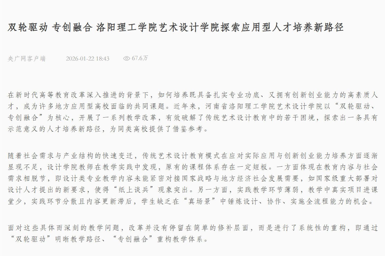 央广网客户端,2026年1月22日,《双轮驱动 专创融合 洛阳理工学院艺术设计学院探索应用型人才培养新路径》