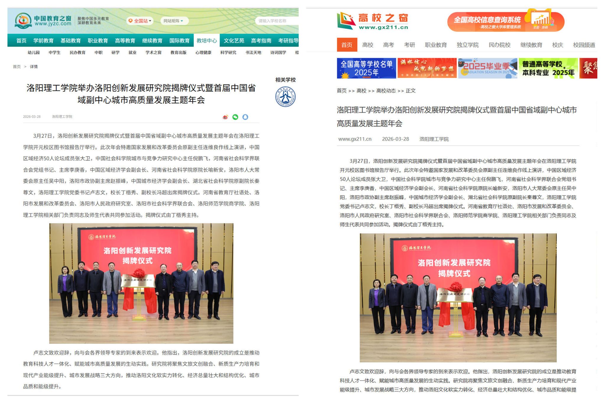 4.高校之窗,2026年3月28日,《洛阳理工学院举办洛阳创新发展研究院揭牌仪式暨首届中国省域副中心城市高质量发展主题年会》