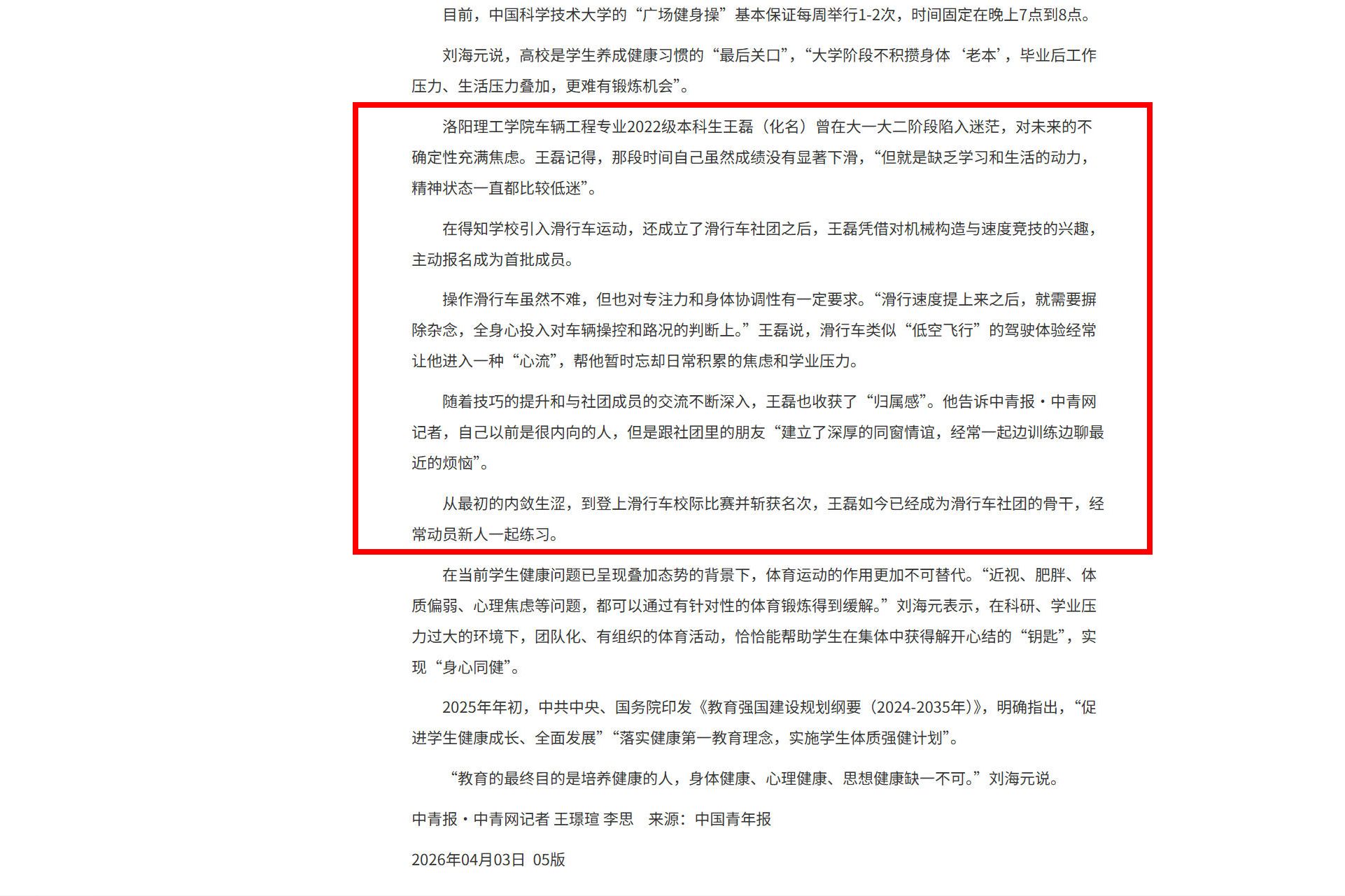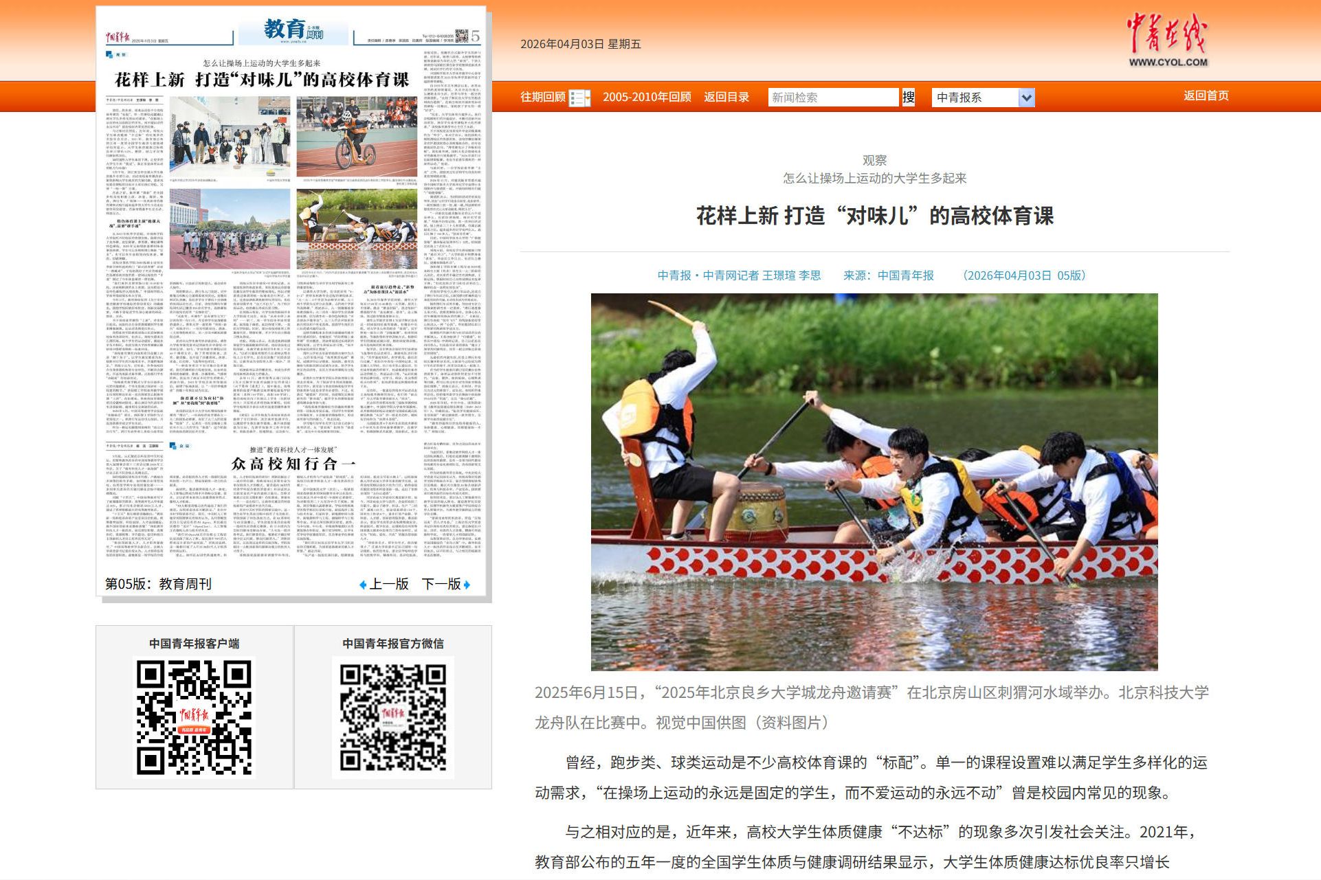 《中国青年报》,2026年4月3日05版教育周刊,《花样上新 打造“对味儿”的高校体育课》