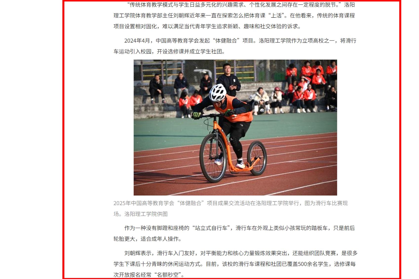 报道中介绍,传统体育教学模式与学生日益多元化的兴趣需求、个性化发展之间存在一定程度的脱节,传统的体育课程项目设置相对固化,难以满足当代青年学生追求新颖、趣味和社交体验的诉求。洛阳理工学院近年来一直在探索怎么把体育课“上活”。2024年4月,中国高等教育学会发起“体健融合”项目。洛阳理工学院作为立项高校之一,将滑行车运动引入校园,开设选修课并成立学生社团。目前,该校的滑行车课程和社团已覆盖500余名学生,选修课每次开放报名经常“名额秒空”。