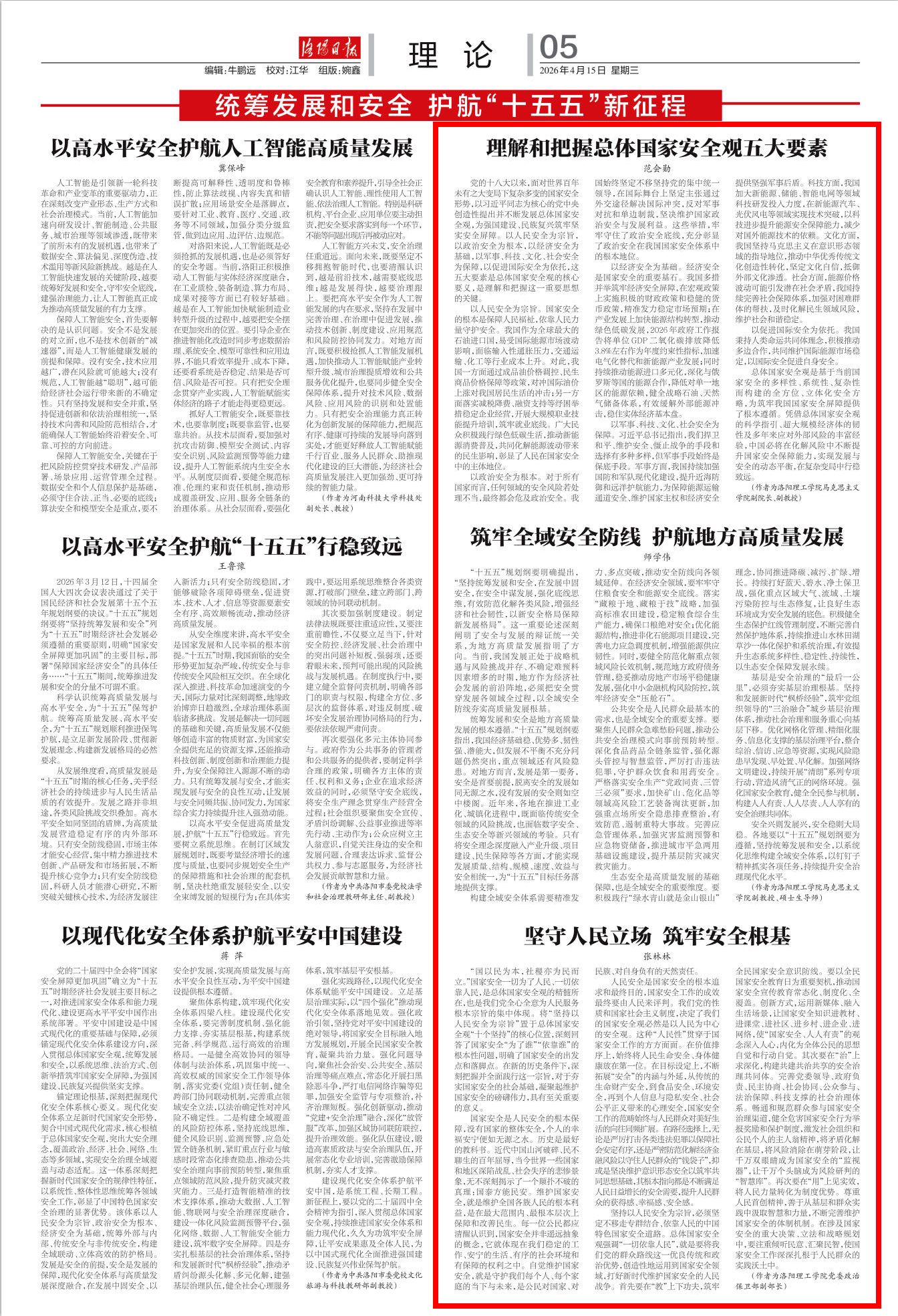 2026年4月15日是第十一个全民国家安全教育日,“统筹发展和安全 护航‘十五五’新征程”是 2026 年第十一个全民国家安全教育日的主题,当日出版的《洛阳日报》第5版,分别以《理解和把握总体国家安全观五大要素》《筑牢全域安全防线 护航地方高质量发展》《坚守人民立场 筑牢安全根基》为题,刊发了我校范会勋、师学伟、张林林3位教师结合本职工作对贯彻总体国家安全观的体会。