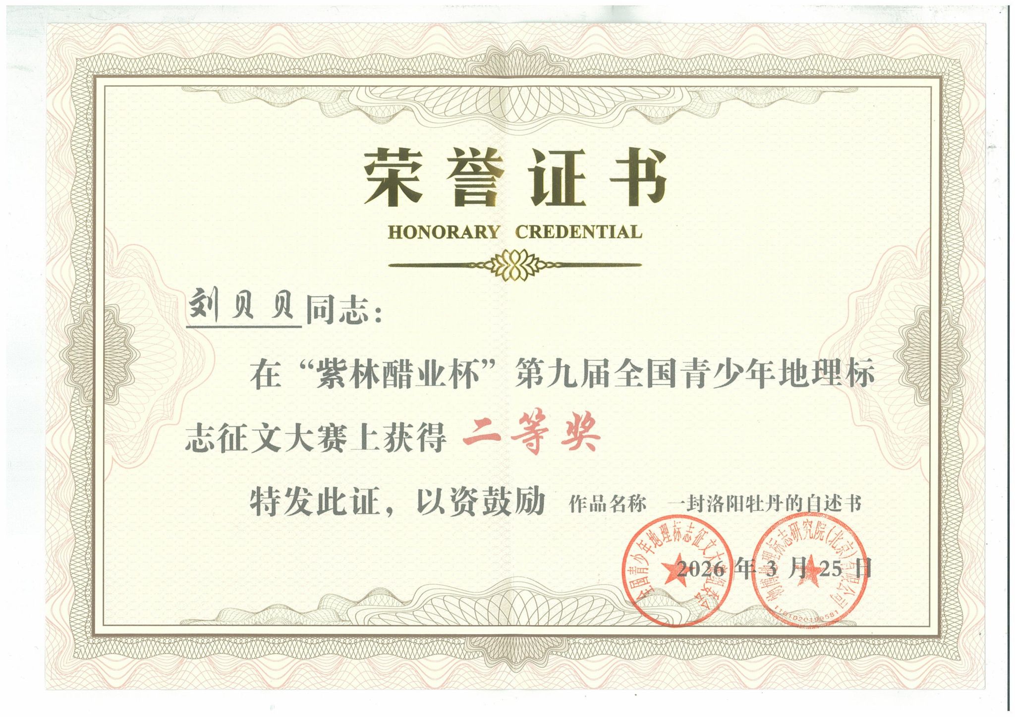 近日,在第九届全国青少年地理标志征文大赛中,我校人文学院杜高阳同学的作品《“膳食一宝”:偃师银条》、经济与管理学院刘贝贝同学的作品《一封洛阳牡丹的自述书》(指导老师:翟玉强)分别荣获一等奖、二等奖。