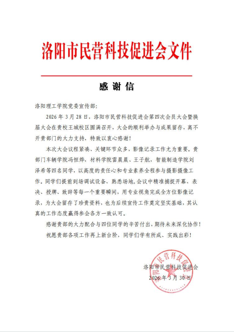 3月30日,洛阳市民营科技促进会向我校党委宣传部发来感谢信,对学校在2026年3月28日洛阳市民营科技促进会第四次会员大会暨换届大会中的大力支持表示感谢,并对参与会议影像记录工作的4名同学提出表扬。