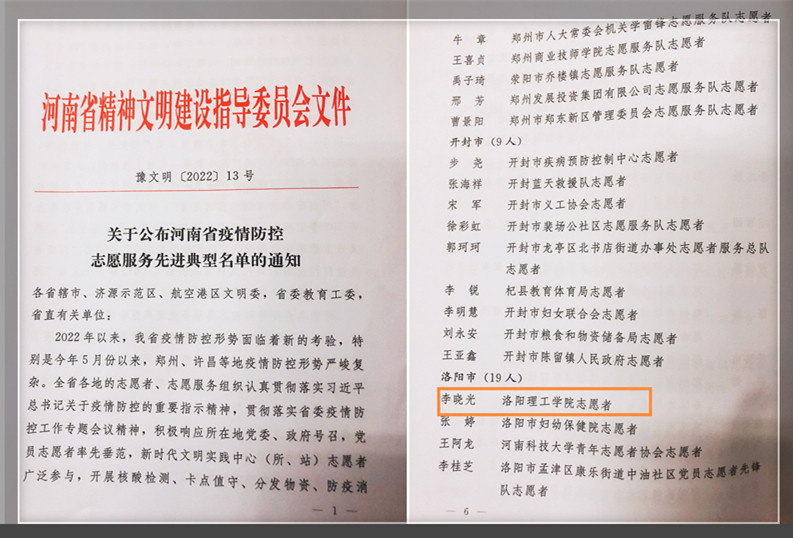 近日,河南省精神文明建设指导委员会下发《关于公布河南省疫情防控志愿服务先进典型名单的通知》(豫文明〔202213号),对全省疫情防控优秀志愿者、优秀志愿服务组织、优秀志愿服务工作者等先进典型进行表彰。机关“红色先锋”志愿服务队荣获“河南省疫情防控优秀志愿服务组织”荣誉称号,邱晓嘉荣获“河南省疫情防控优秀志愿服务工作者”荣誉称号,李晓光荣获“河南省疫情防控优秀志愿者”荣誉称号。另悉,机关孟原荣获“洛阳市疫情防控优秀志愿者”荣誉称号。