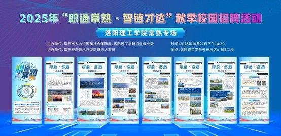 常熟市——地处环上海经济圈核心区域,是中国历史文化名城,素有“鱼米之乡”的美称。多年来常熟城市综合实力始终位居全国百强县(市)第一方阵。10月27日,常熟组团企业抵达洛阳理工学院,常熟企业专场双选会在开元校区A-B楼二楼连廊顺利召开。本次双选会聚焦区域优质企业与高校毕业生的精准匹配,20余家常熟重点企业到场,带来覆盖多领域的优质岗位,为毕业生搭建起直通长三角优质企业的就业桥梁。