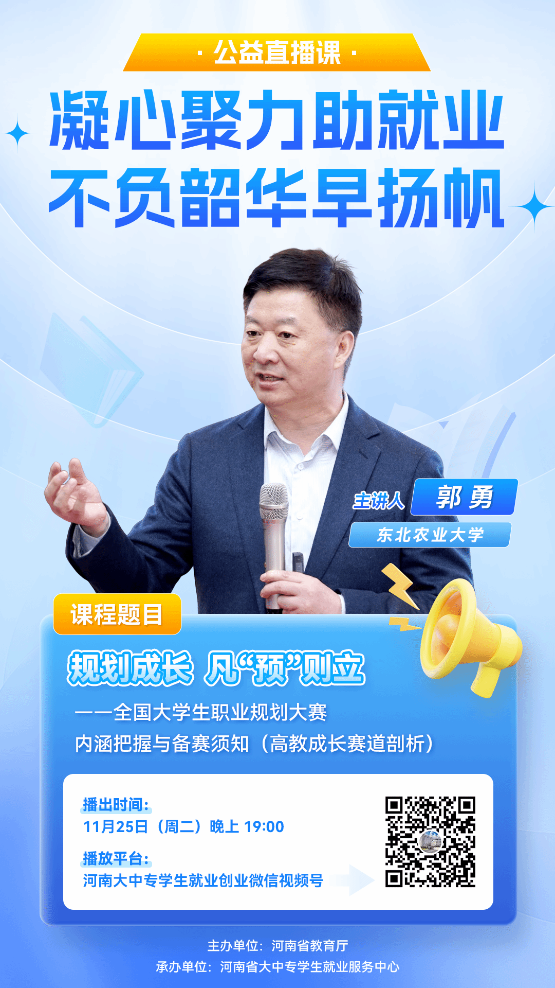 职规赛如何高效备赛?新规划如何赋能新未来?11月25日(周二)19:00,河南省“互联网+就业指导”公益直播课开讲“规划成长,凡预则立——全国大学生职业规划大赛内涵把握与备赛须知(高教成长赛道剖析)”,特邀东北农业大学郭勇老师带领学子精准锁定发力点,让规划更到位、参赛更从容、就业更有底!