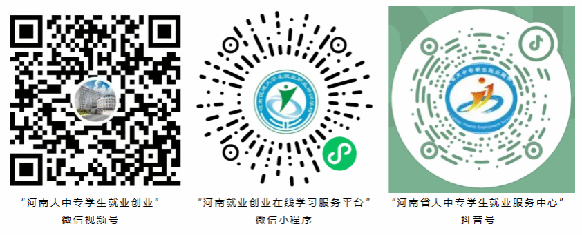 扫码识别下方“河南大中专学生就业创业”“河南就业创业在线学习服务平台”“河南省大中专学生就业服务中心”二维码,待直播开始即可观看。同时请同学们扫码识别课程视频后方二维码,完成随堂测验。