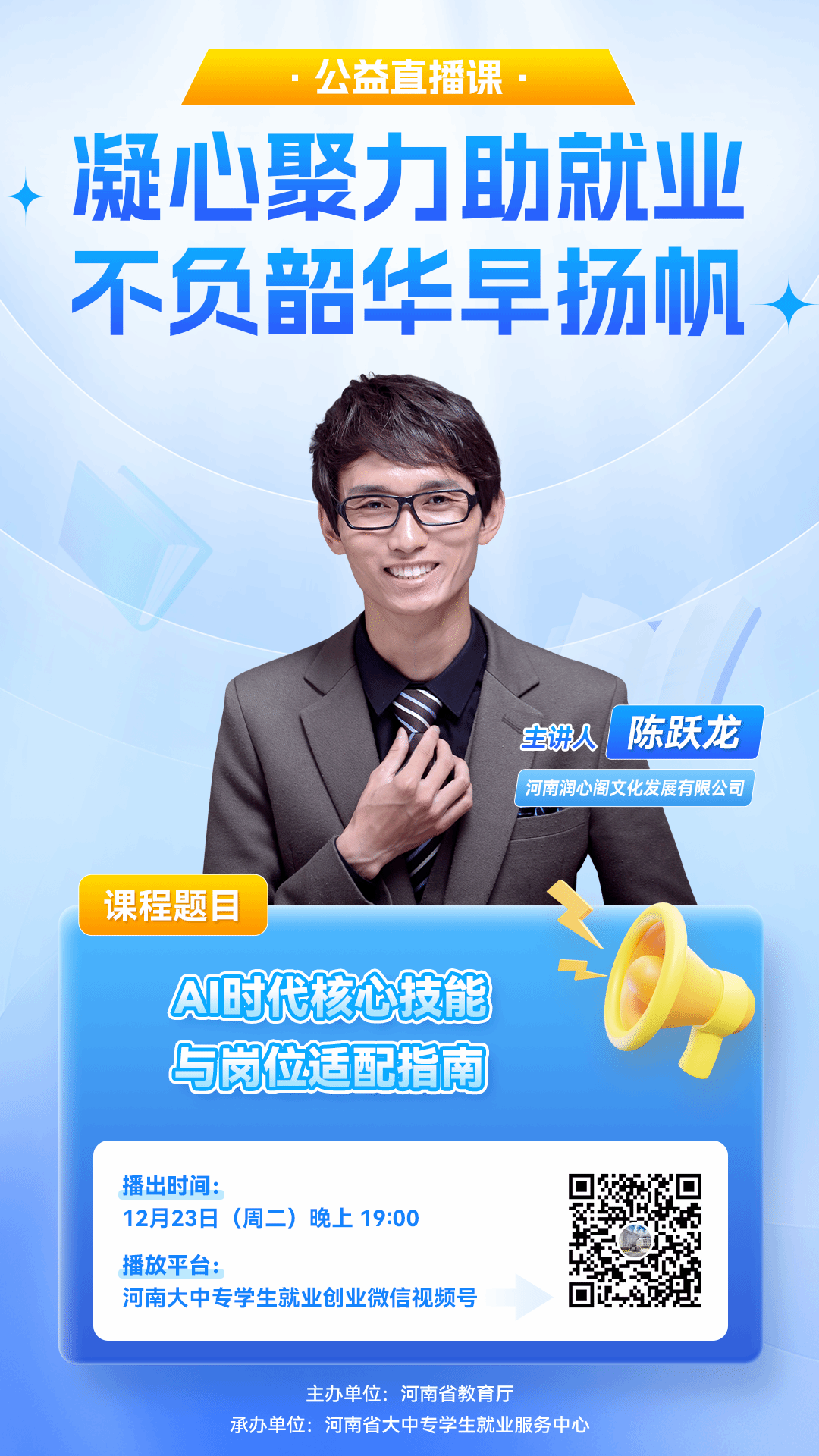 为助力河南高校学子精准把握AI时代就业新机遇,破解职业发展困惑,12月23日(周二)19:00,河南省“互联网+就业指导”公益直播课将推出“AI时代核心技能与岗位适配指南”,特邀河南润心阁文化发展有限公司陈跃龙作为主讲人,为广大青年学子献上一场兼具理论深度与实践价值的就业指导盛宴。