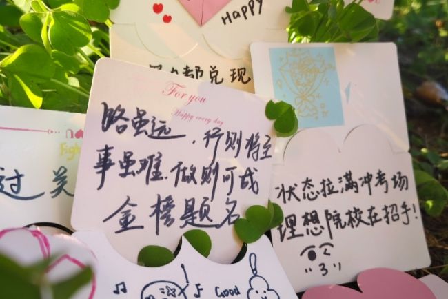 活动现场精心筹备了色彩各异的祝福卡片,每张卡片都承载着满满的心意——既有“道阻且长,行则将至”的坚定勉励,也有“状态拉满冲考场”的热血鼓劲;既有灵动可爱的笑脸涂鸦,也有寓意吉祥的福运贴纸与“金榜题名”“理想院校在招手”的美好期许。纸上的文字、手绘的温情、创意的贴纸,都在悄悄诉说:“你们的备考路,我们始终相伴”。