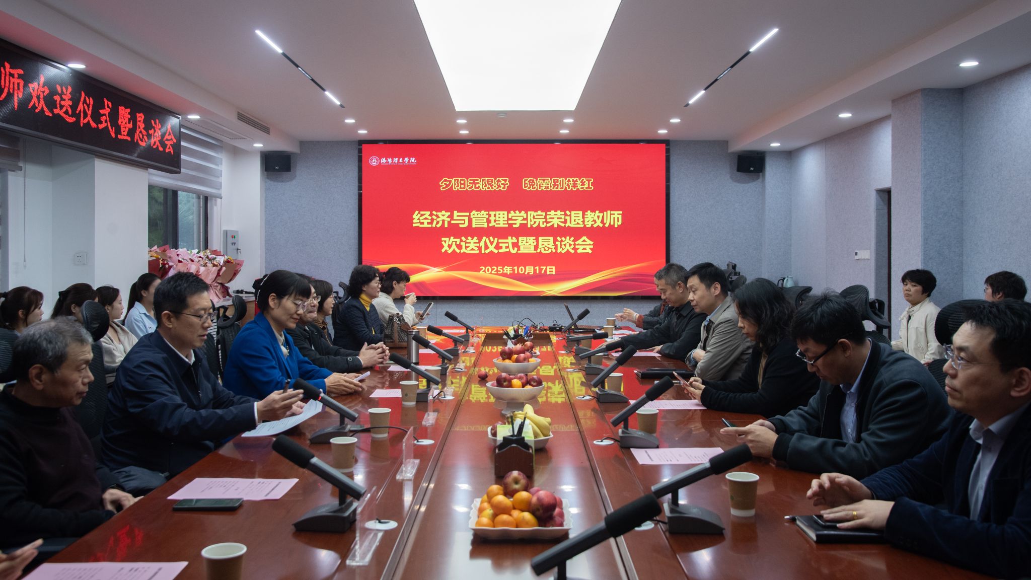 岁月鉴初心,荣休敬韶华。10月17日下午,经济与管理学院在207会议室举行荣退教师欢送仪式暨恳谈会,共同欢送荣退的胡延松、沈萍、张建军、贺勋、陈素玲、李玉华、桂晓珏等七位老师。副校长、经济与管理学院院长冯超,学院全体班子成员、教师代表、学生代表50余人齐聚一堂,共同见证了这一难忘时刻。学院党委书记罗瑞锋主持会议。