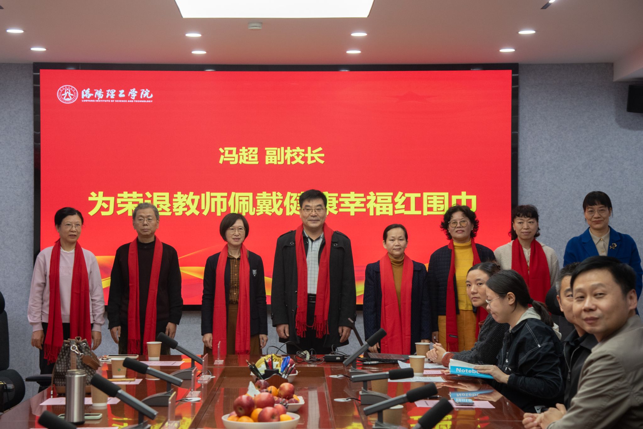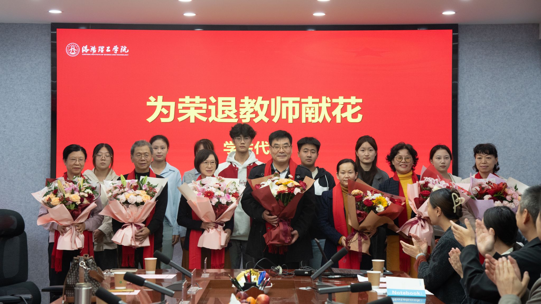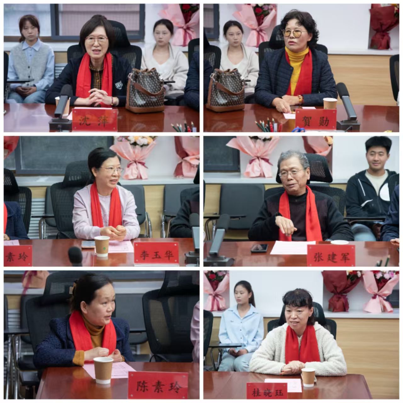 欢送会上,冯超为七位荣退的老教师佩戴上红围巾,以表达对他们诚挚的祝福!学生代表为老师们送上鲜花,青年教师代表杨頔、刘苗做了致敬发言,与会教师分别从不同角度回忆起与七位老师一起工作的美好时光,深情表达了对老教师的敬意和感激之情。