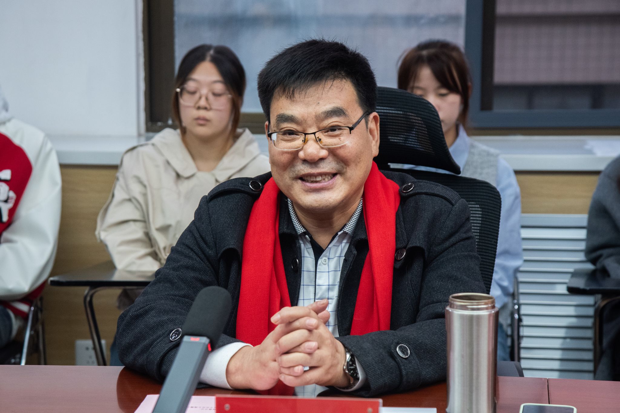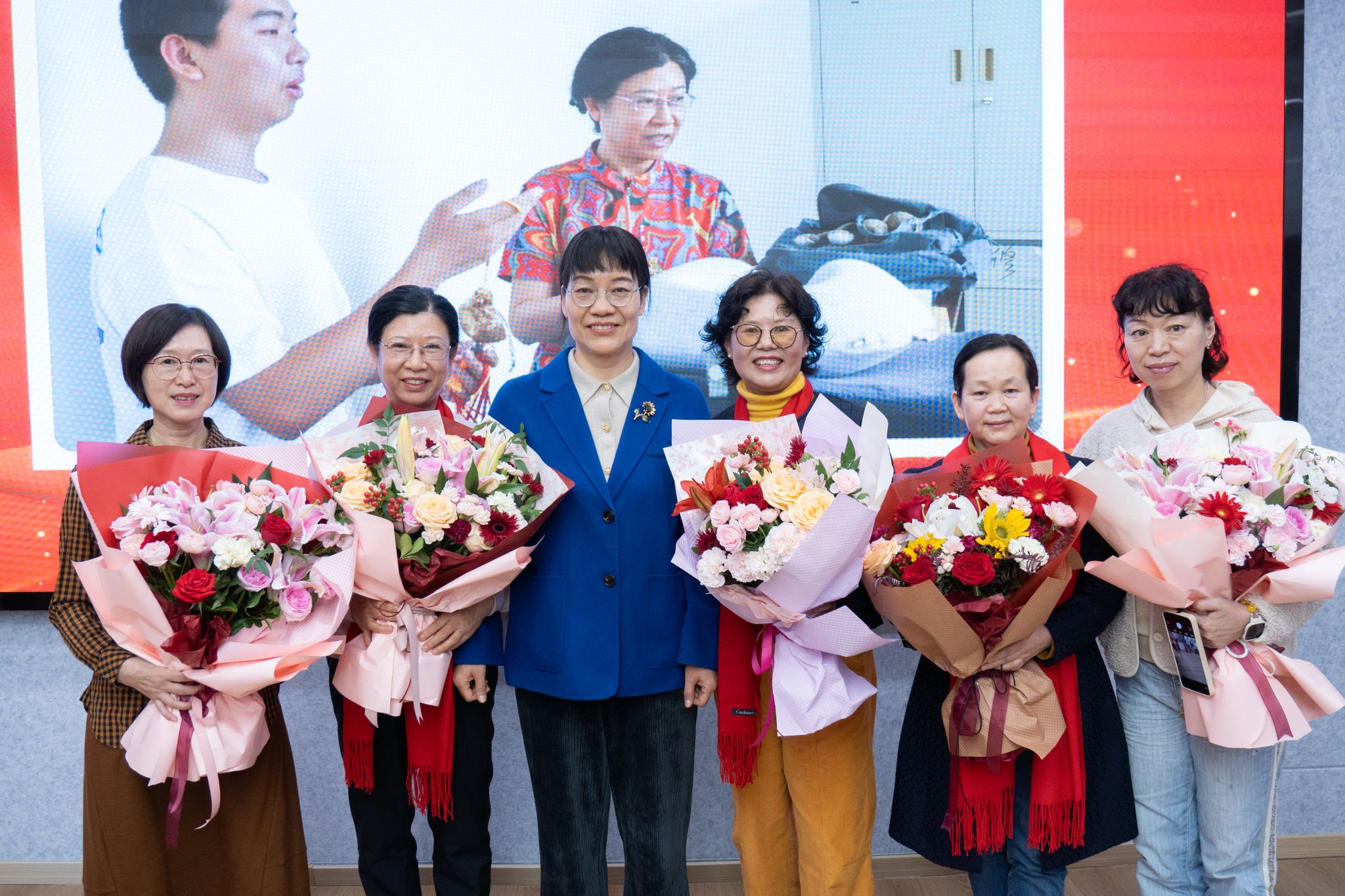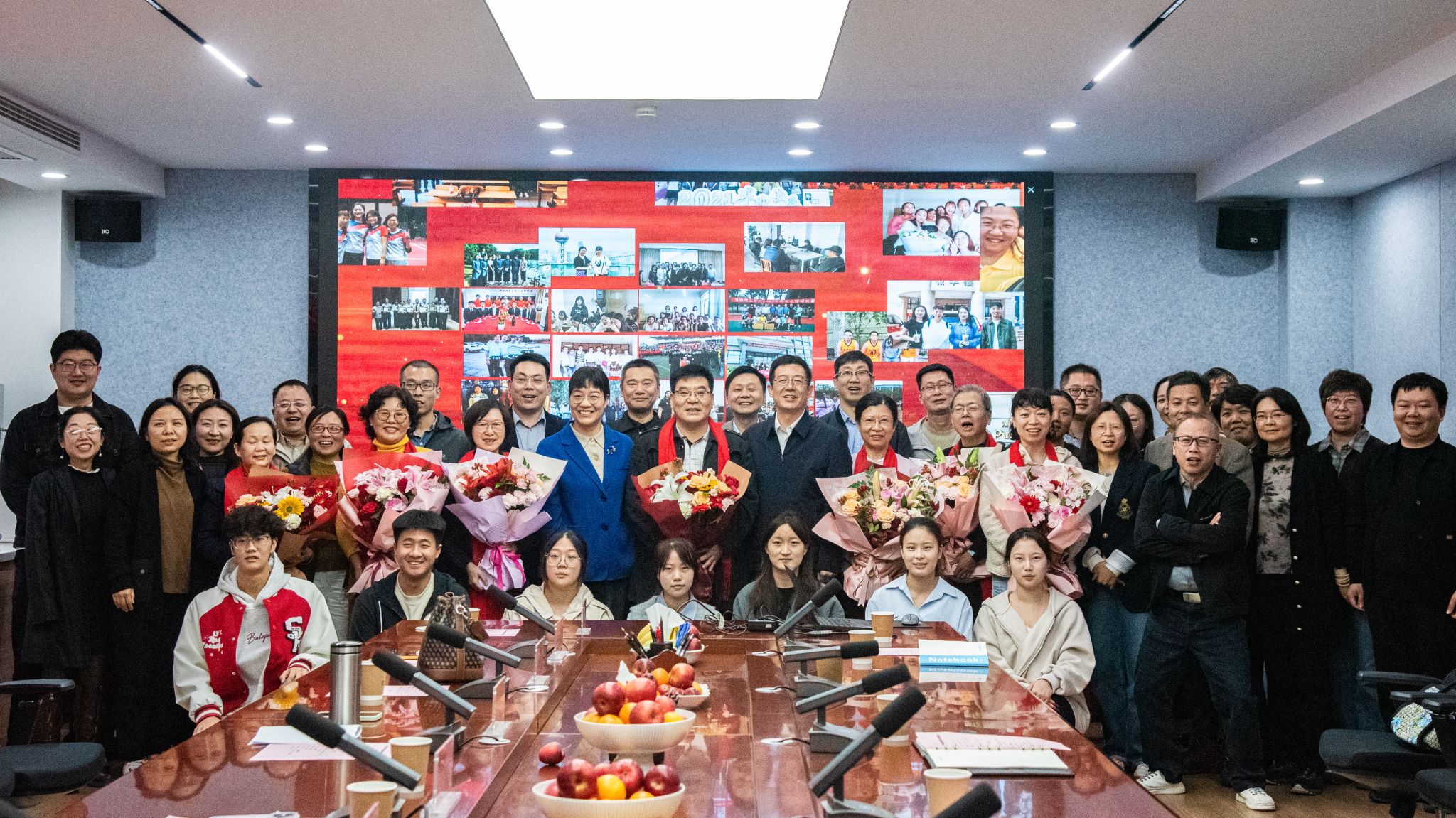 欢送会上,冯超为七位荣退的老教师佩戴上红围巾,以表达对他们诚挚的祝福!学生代表为老师们送上鲜花,青年教师代表杨頔、刘苗做了致敬发言,与会教师分别从不同角度回忆起与七位老师一起工作的美好时光,深情表达了对老教师的敬意和感激之情。