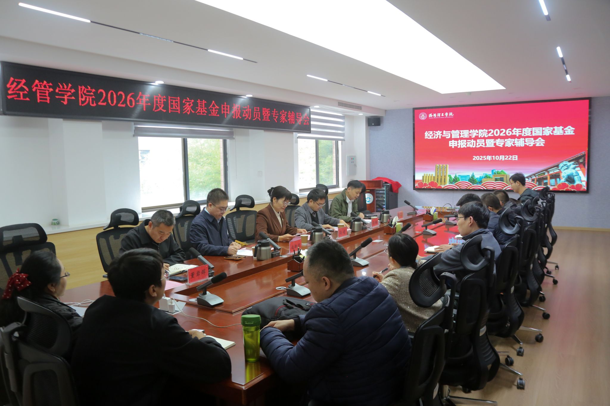 10月22日,经济与管理学院在XB207会议室召开了2026年度国家基金申报动员暨辅导培训会,副校长冯超、科研处副处长赵棚鸽出席会议并指导,学院领导班子、2025年获批立项国家基金教师代表以及拟申报2026年度国家基金教师参会。