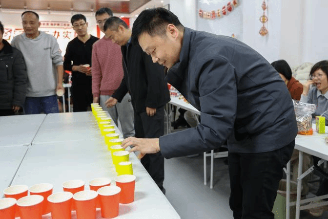 除了精彩的节目表演,活动现场还精心设计了富有挑战性的趣味游戏环节。在“翻杯子”游戏中,老师们需要运用巧劲与耐心,在限定时间内将倒扣的杯子逐一翻转,既要追求速度,更要保持稳定。现场气氛随着一个个杯子的成功翻转而高潮迭起,掌声与欢笑声交织成片。这个看似简单的游戏,既考验了参与者的专注力与精细操作能力,也让大家在轻松愉快的氛围中感受到挑战自我、专注当下的乐趣,进一步增强了老师们的参与感与集体活力。