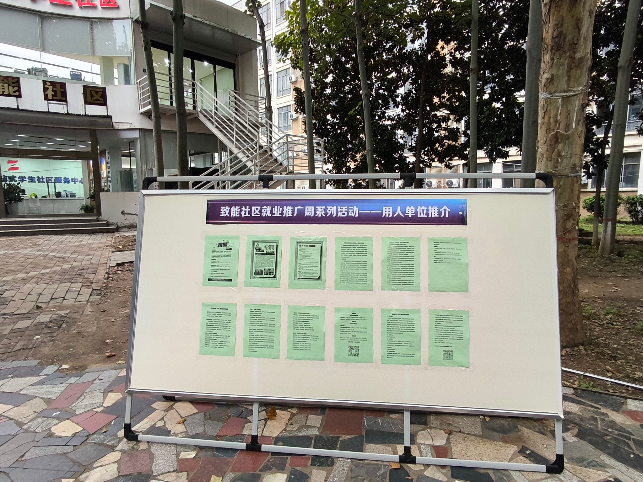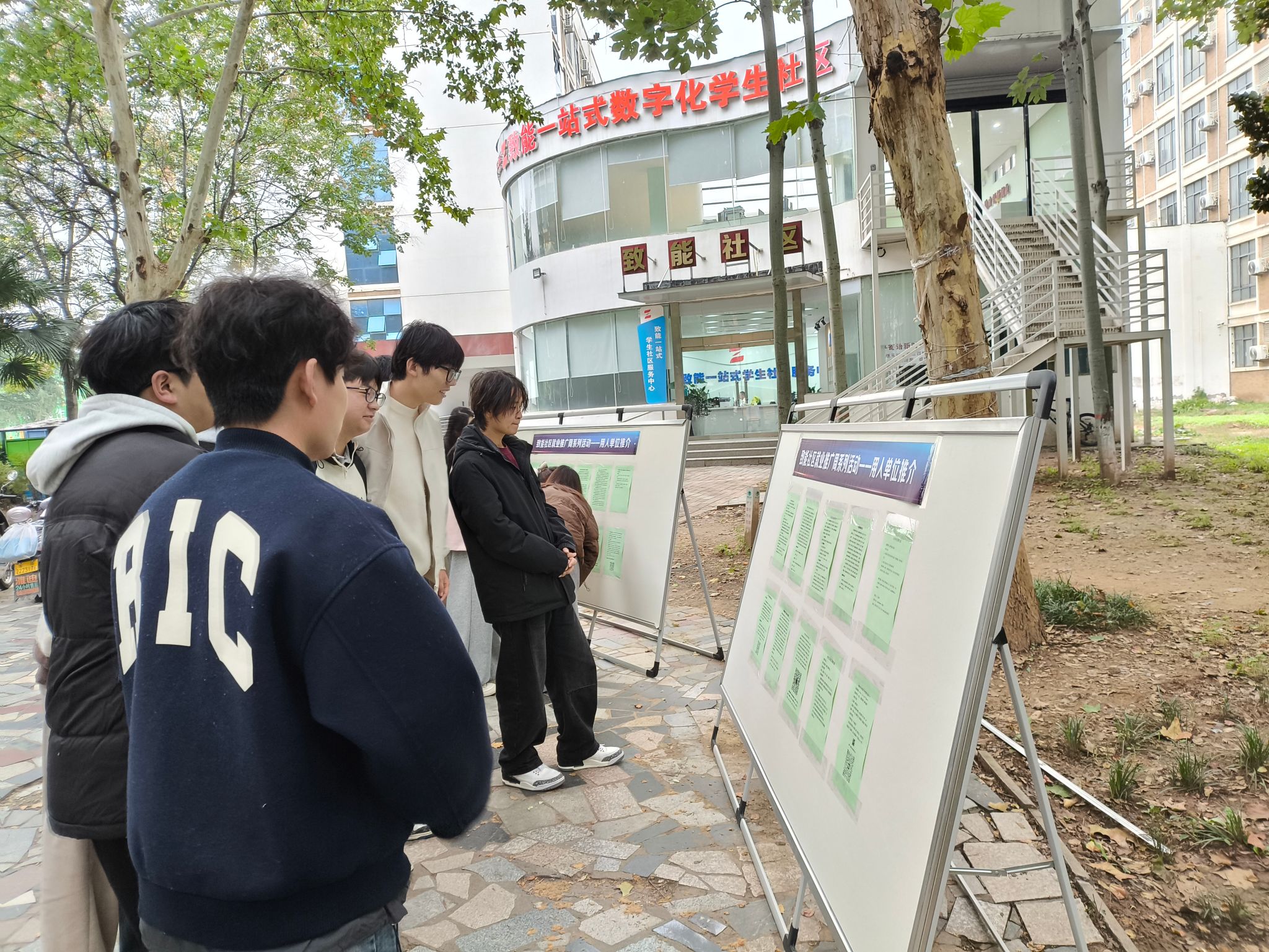 为拓宽毕业生求职渠道,帮助他们获取更多的招聘信息,10月22日下午,致能社区计算机学院在社区楼前组织开展了2026届毕业生线下招聘推介活动,集中张贴了来自软件开发、人工智能、网络安全等领域的30余家企业招聘信息,吸引众多毕业生驻足,现场气氛热烈,为毕业生提供了针对性较强、信息较为集中的求职资讯。
