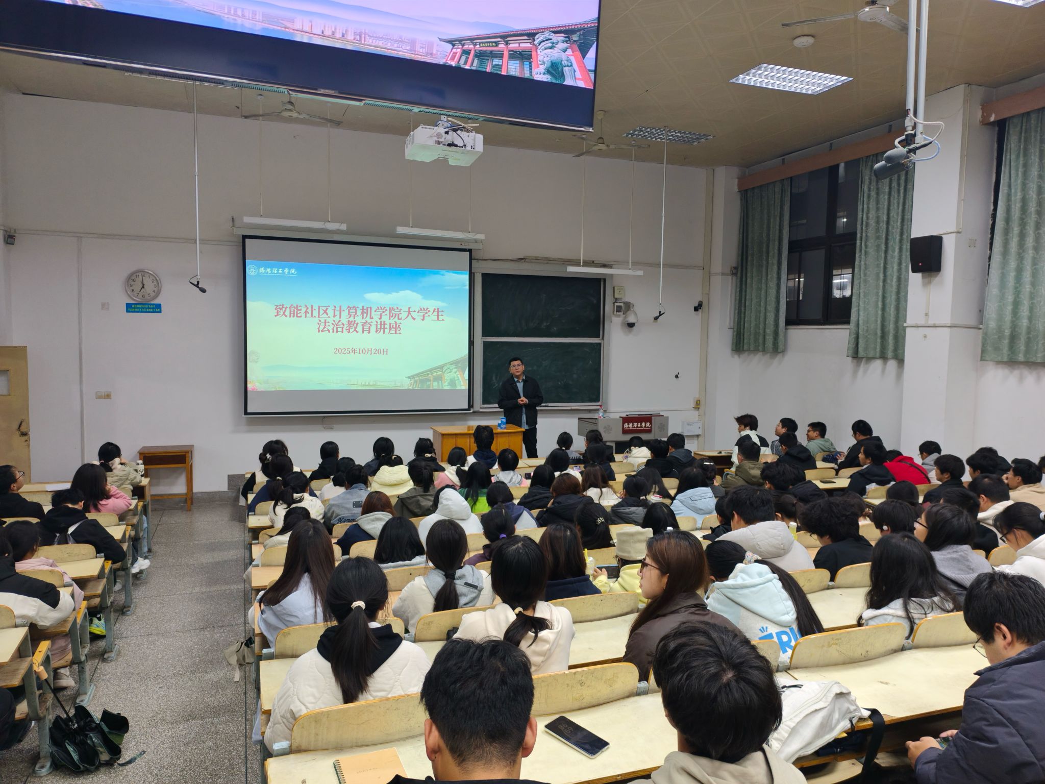 为增强广大学生的法治观念与安全意识,10月20日晚,我院在开元校区XC1教室举行致能社区计算机学院大学生法治教育专题讲座。学校保卫处副处长张林林受邀做报告,学工办副主任吴程浩以及2025级新生代表参加活动。
