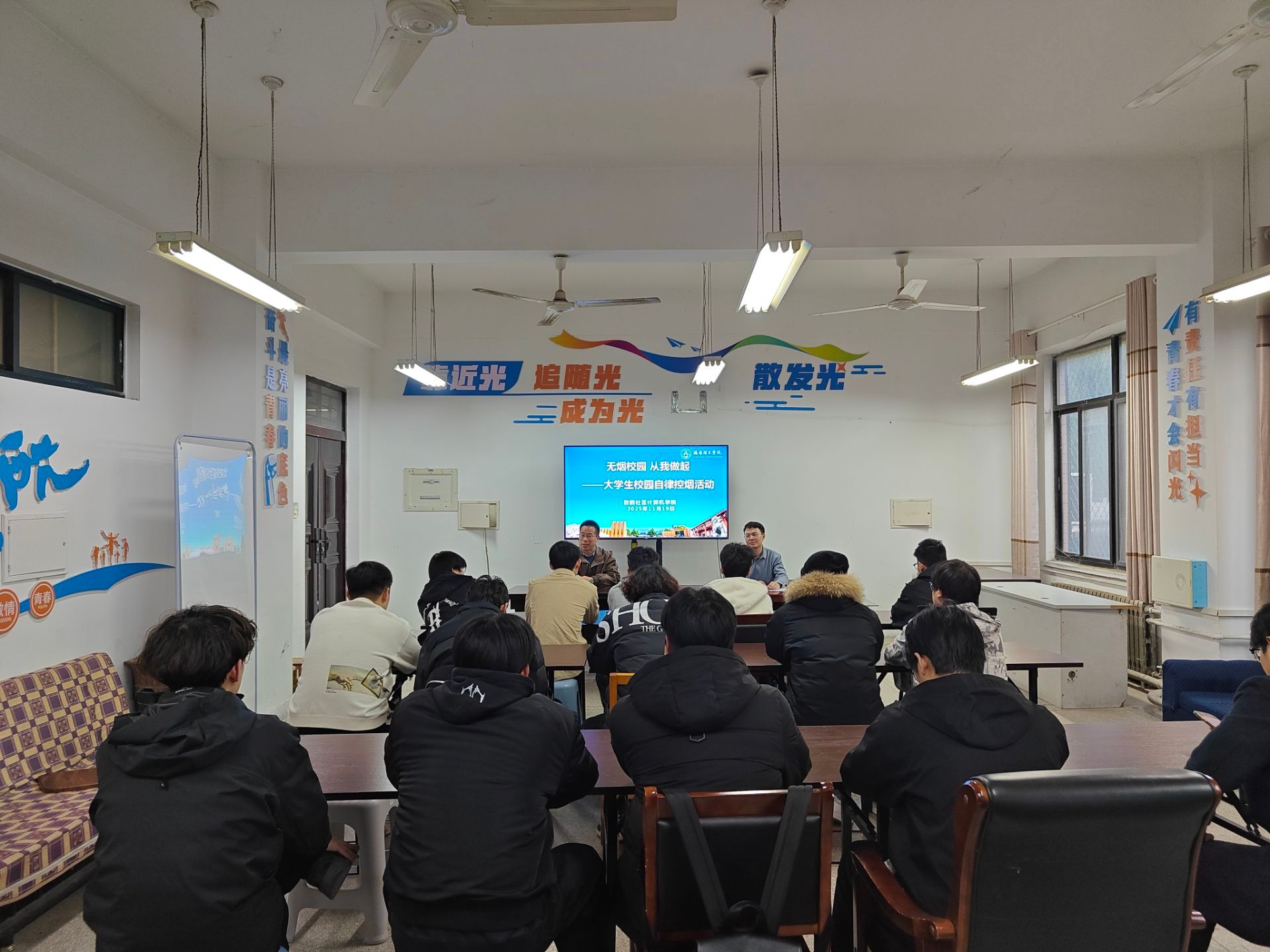 为营造文明向上的校园与社区环境,2025年11月19日,致能社区计算机学院在开元校区实验楼A105组织开展了“无烟校园从我做起”座谈会。学院党委副书记邵建伟、学工办副主任吴程浩以及各年级有抽烟倾向(行为)的学生参加。吴程浩主持座谈会。