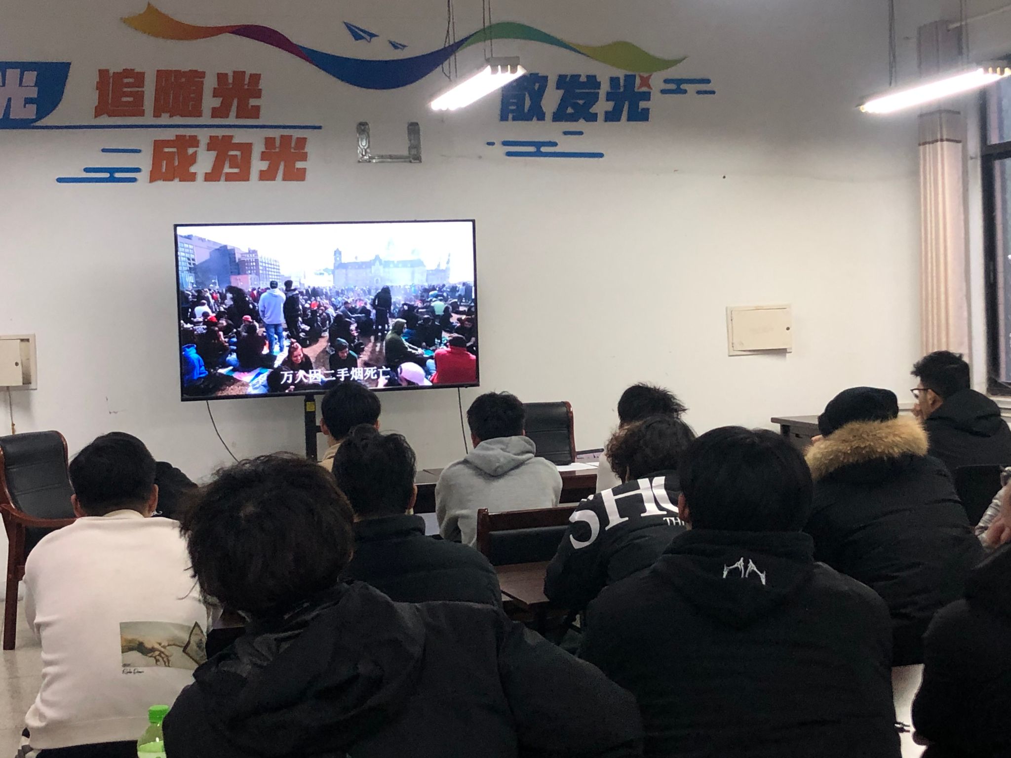大家首先观看了世界无烟日宣传教育视频、吸烟引发火灾的案例等警示宣传资料。视频中抽烟对身体器官的摧残和抽烟引发火灾的惨状,深深触动了在场的每一个人。