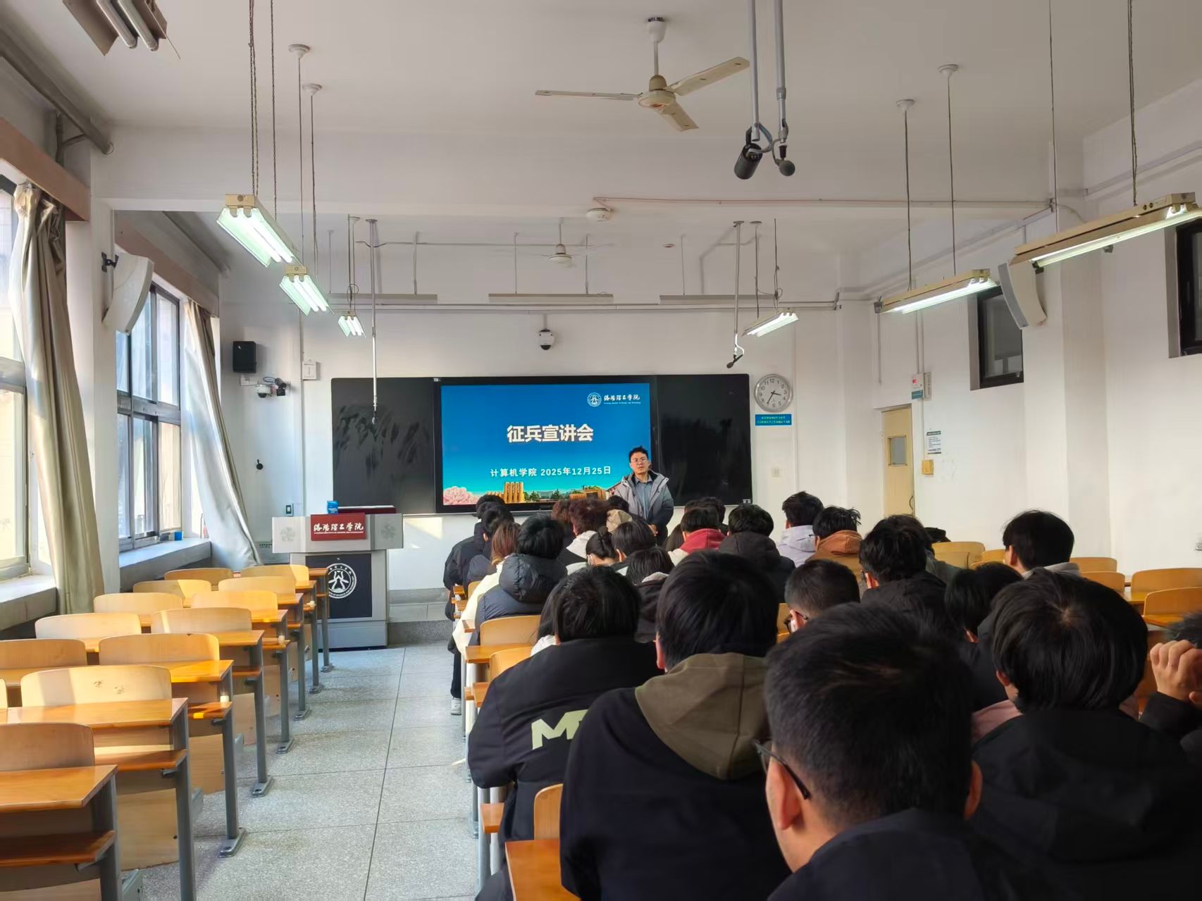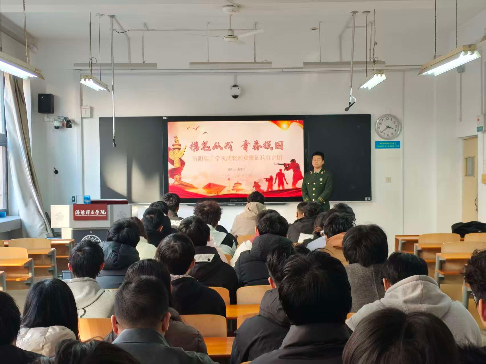 为深入贯彻国家征兵政策,大力弘扬爱国主义精神,激发广大青年学子携笔从戎、报效国家的热情,计算机学院于2025年12月25日在开元校区XC107教室举办了征兵宣讲会。学工办副主任吴程浩、退役士兵代表以及各年级有意向参军入伍的学生共计40人参加了会议。