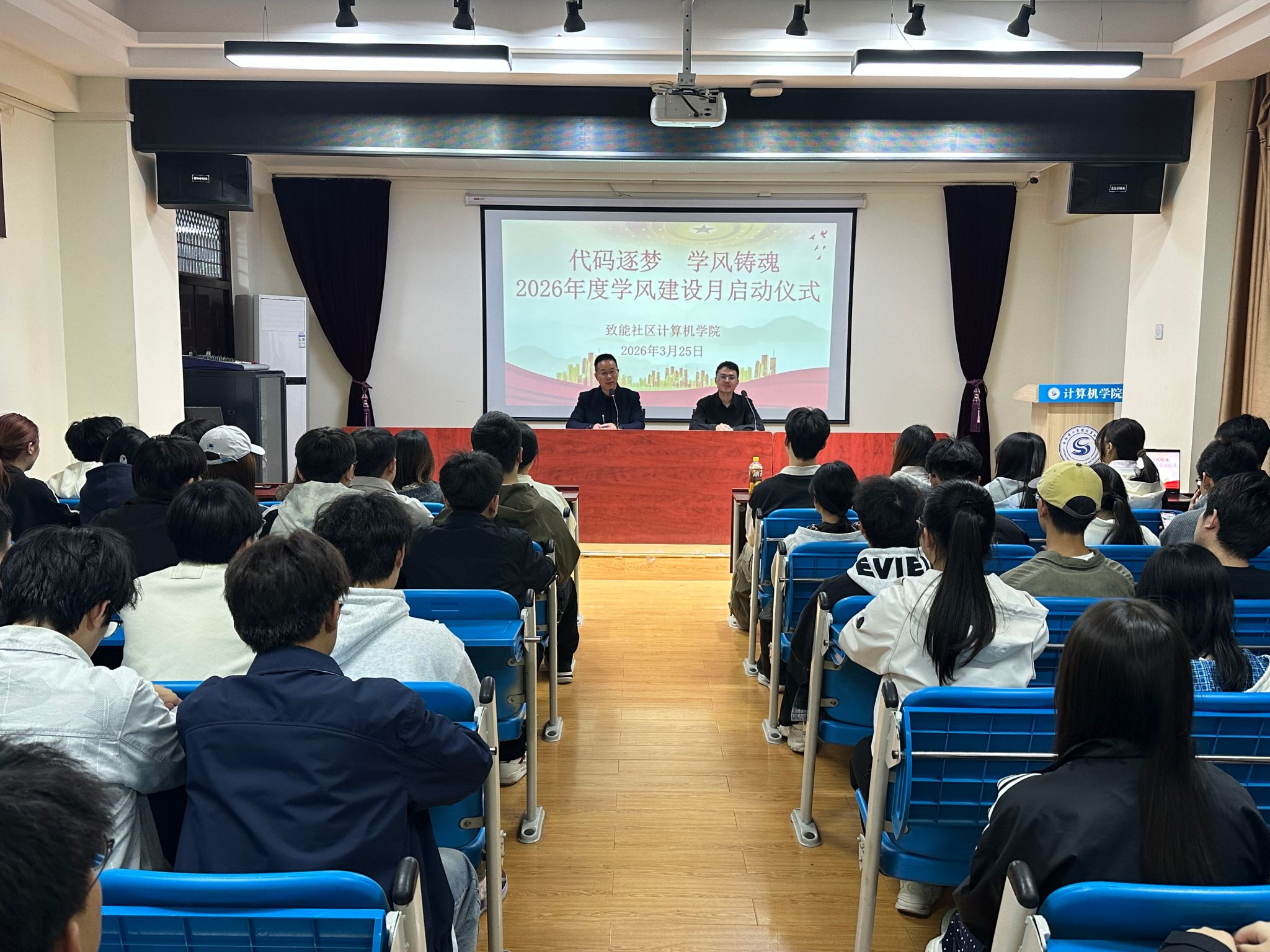 为深入推进学风建设,营造勤学、善思、笃行的育人氛围,3月25日,致能社区计算机学院在实验A212会议室举行2026年度学风建设月启动仪式。学院党委副书记邵建伟、学工办副主任吴程浩及各班级、学生会各部门干部、学生代表100余人参加活动。吴程浩主持会议。