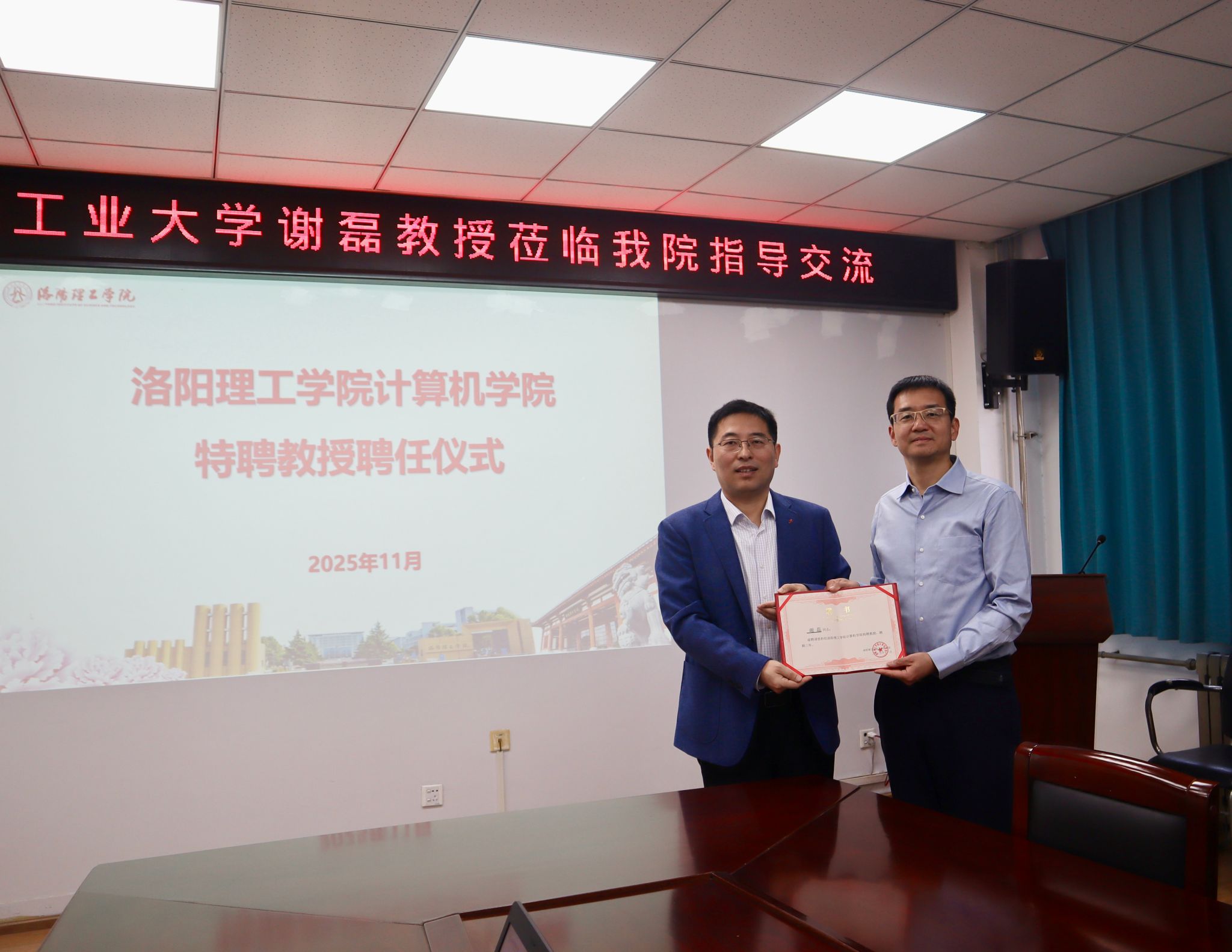 2025年11月22日上午,洛阳理工学院计算机学院于SA204举行特聘教授聘任仪式,特别邀请西北工业大学谢磊教授加盟,担任学院特聘教授。计算机学院院长王国强、副院长芦丹以及学院骨干教师代表等参加了聘任仪式。