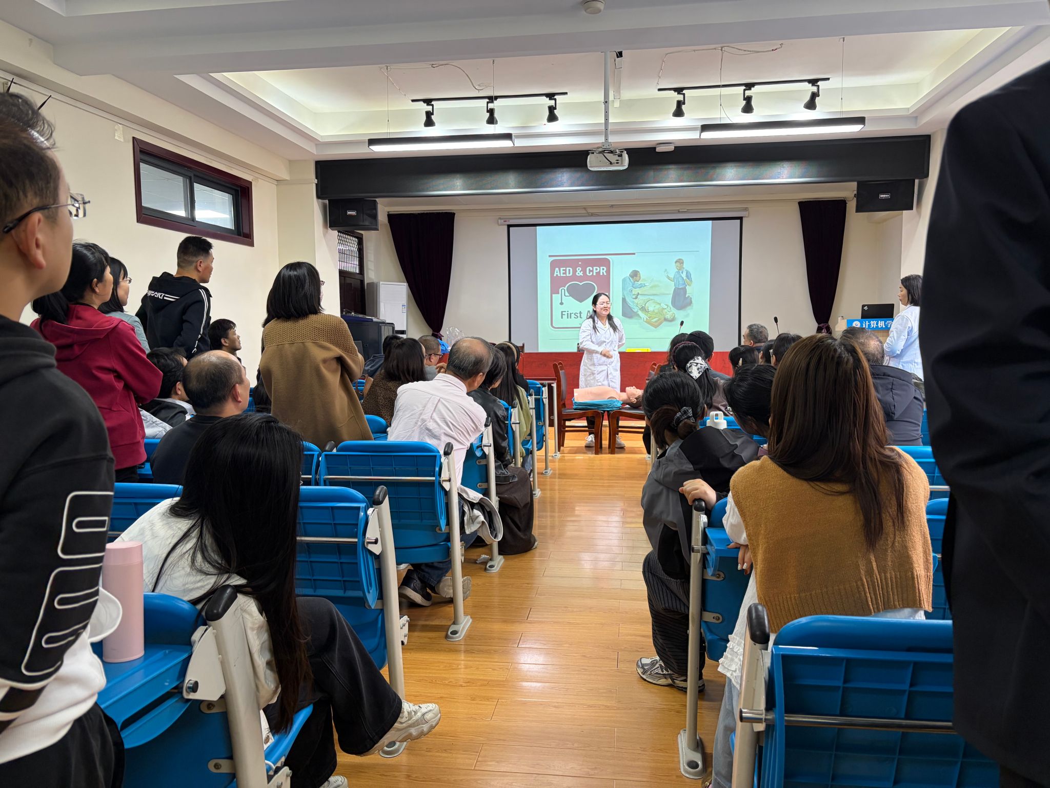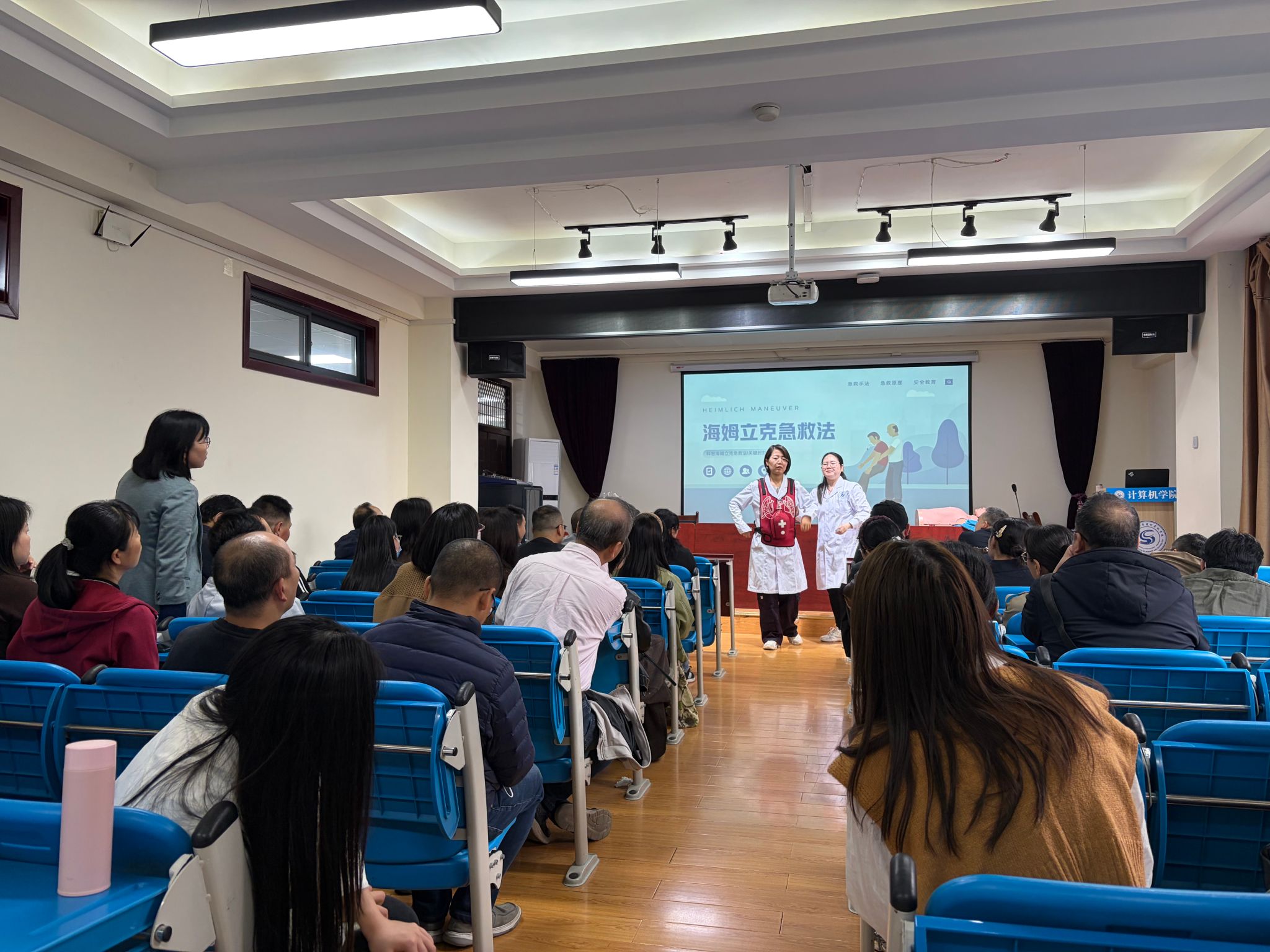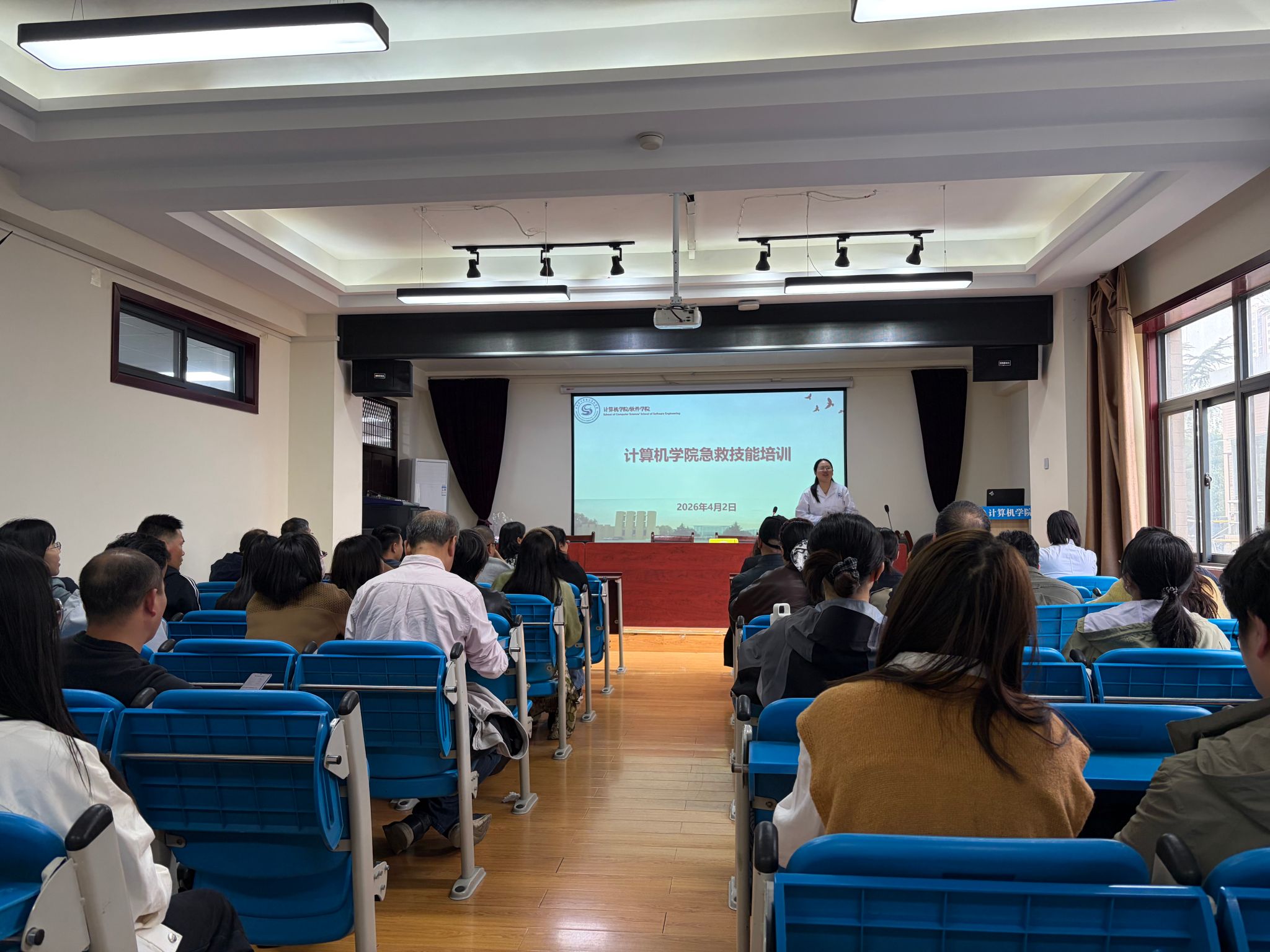 为提升教职工应急自救互救能力,筑牢校园安全防线,2026年4月2日,计算机学院组织开展急救技能专项培训,校医院丁笑笑医生受邀担任主讲人,学院全体教师参与培训。
