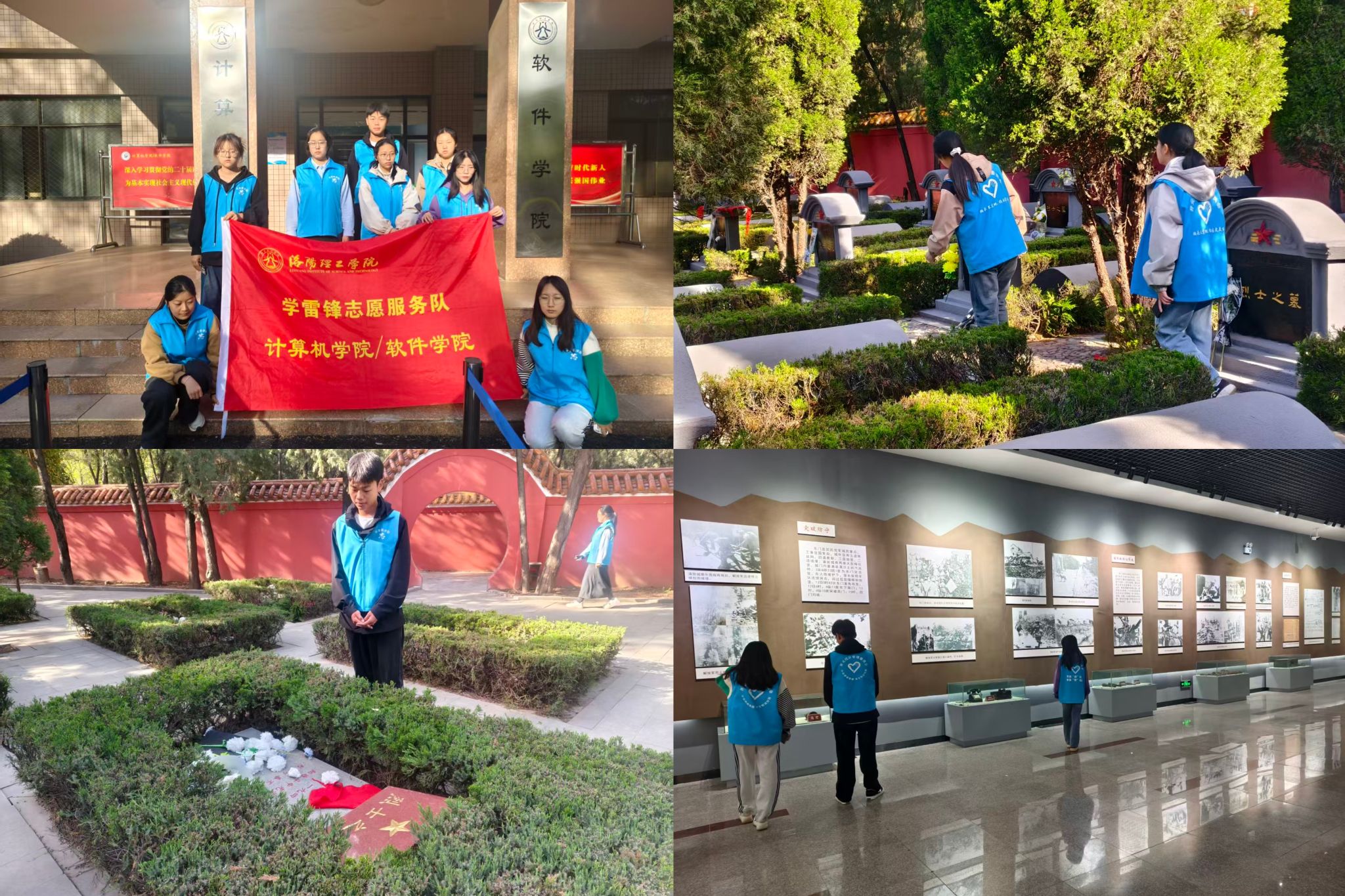 陵园内苍松翠柏、庄严肃穆,志愿者们怀着崇敬之心,分组擦拭烈士墓碑、敬献白菊与黄菊,细致清扫陵园环境,用朴素行动传递对英烈的缅怀与敬意。祭扫结束后,志愿者们参观了洛阳革命烈士事迹陈列馆与无名烈士区,在史料、遗物前驻足感悟,沉浸式重温峥嵘岁月,深刻体悟英烈舍生取义的崇高精神。