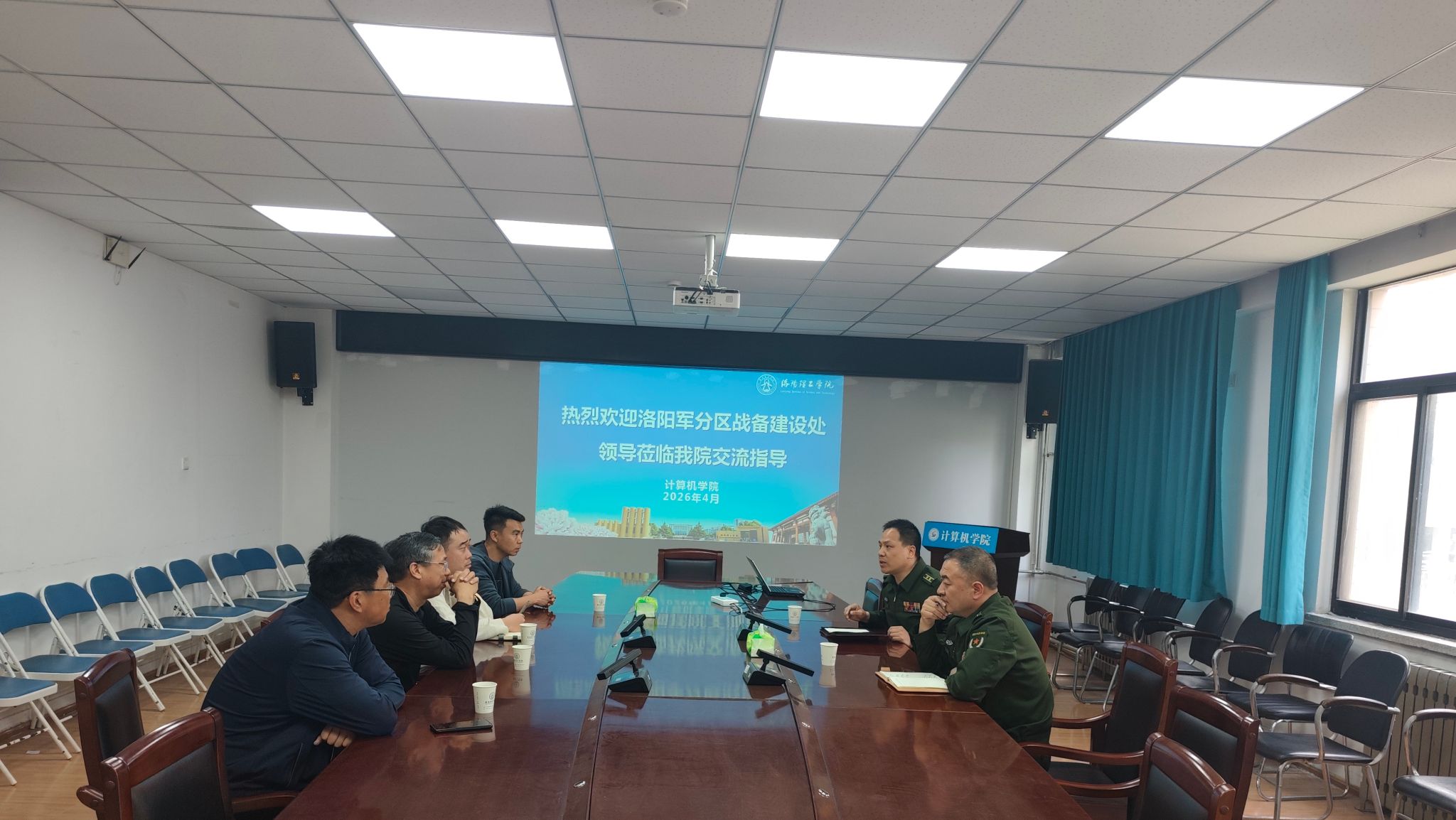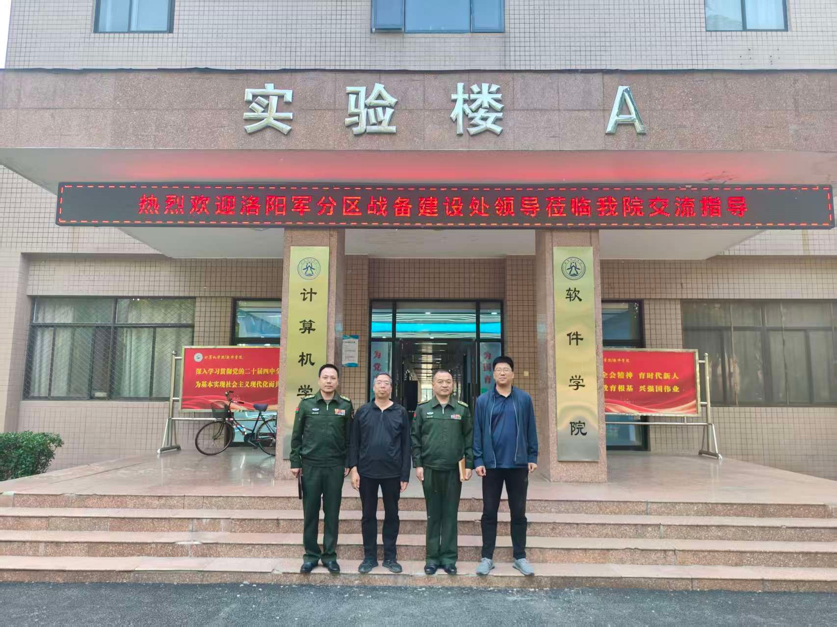 4月16日,洛阳军分区战备建设处负责人一行莅临计算机学院进行调研交流,共商网络对抗人才培养与军地协同发展事宜。学校武装部副部长张恒、计算机学院副院长李明照、学工办副主任吴程浩、实验中心主任韩哲、博士宋宵明参加调研。