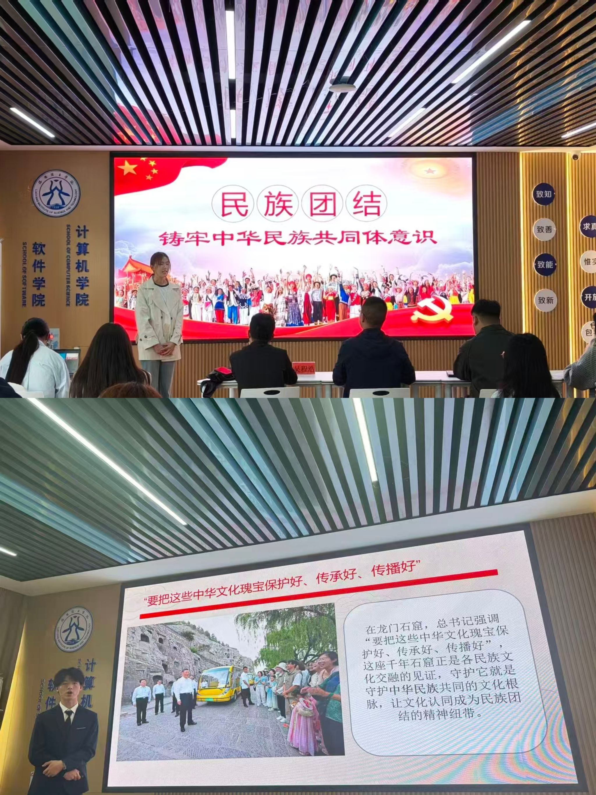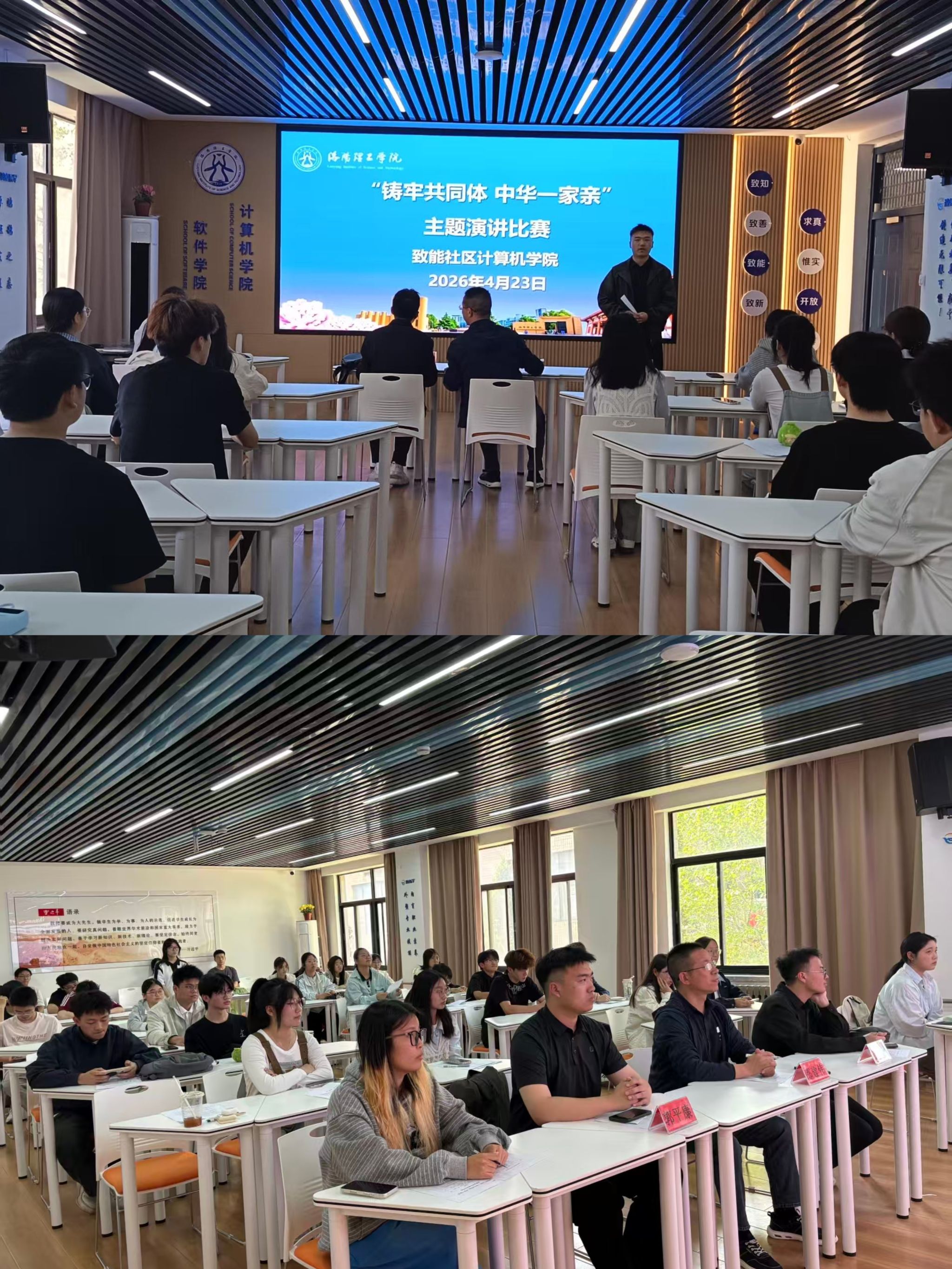 4月23日下午,致能社区计算机学院在开元校区实验楼A210举办“铸牢共同体 中华一家亲”主题演讲比赛。学院党委副书记邵建伟、学工办副主任吴程浩、辅导员郭平康以及参赛选手和学生观众代表参加活动。郭平康主持比赛活动。