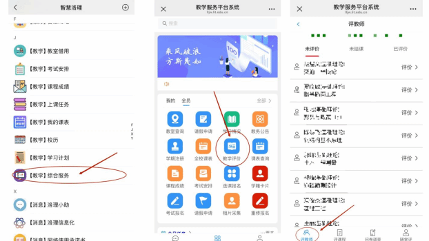 2.手机端进入“智慧洛理→综合服务→教学评价→点击本学期课程进行评价”。如下图: