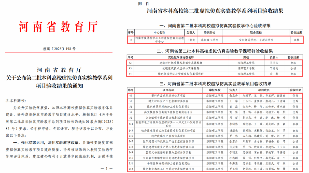近日,河南省教育厅办公室印发《关于公布第二批本科高校虚拟仿真实验教学系列项目验收结果的通知》(教高〔2025〕198号)。我校在本次验收中表现优异,共有1个实验教学中心、3个课程群及14个实验教学项目顺利通过验收,其中5个项目荣获“优秀”等级,充分彰显了我校在虚拟仿真实验教学改革与创新方面取得的显著成效。