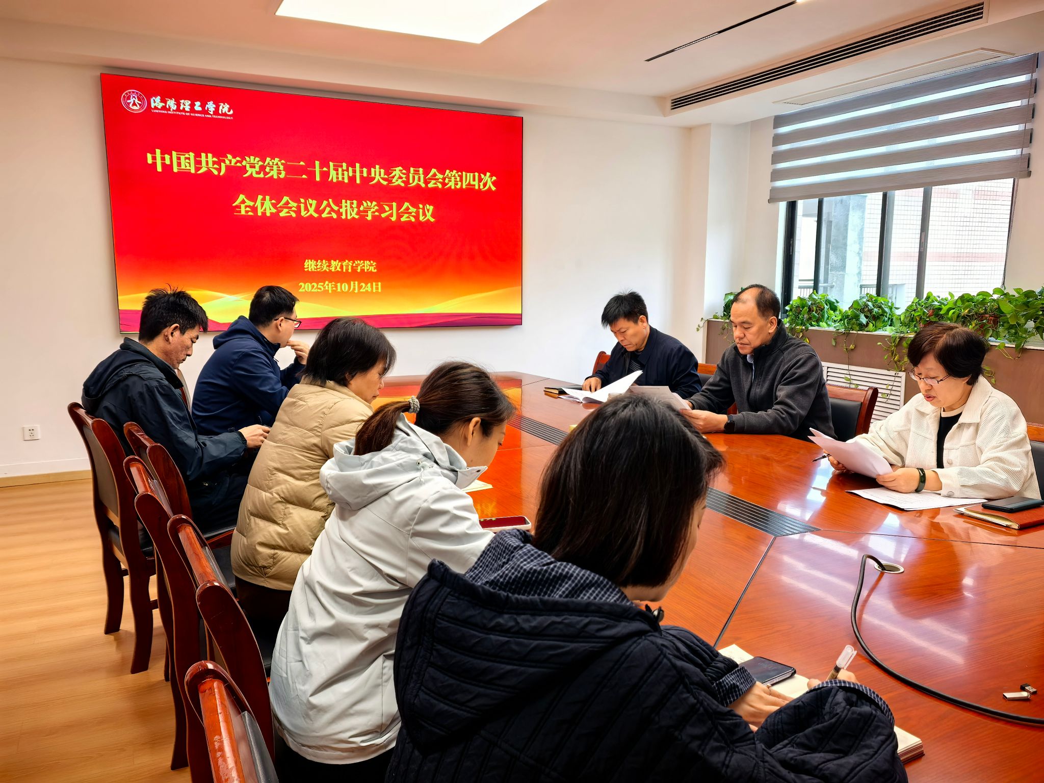 10月24 日上午9点40分,继续教育学院召开“中国共产党第二十届中央委员会第四次全体会议公报”学习会议,全体教职工参加了此次会议。
