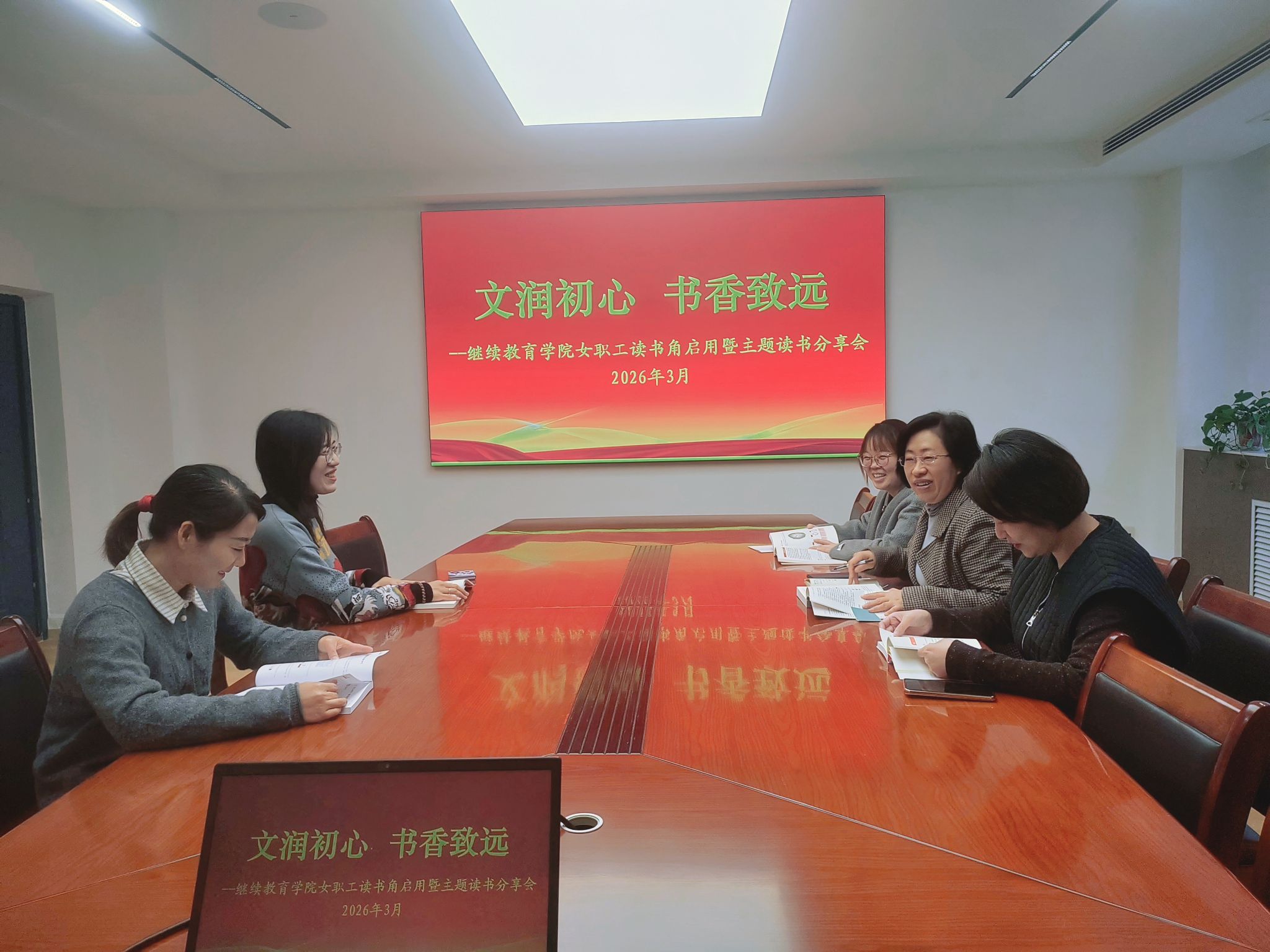 为深入学习贯彻习近平总书记关于工人阶级和工会工作的重要论述,落实校工会“巾帼绽芳华 奋进建新功”三八国际妇女节系列活动安排,展现我院女教职工自尊自信、自立自强的精神风貌,营造关爱女职工、助力成长成才的良好氛围,在校工会和院领导的大力支持下,3月6日我院“文润初心 书香致远”女职工读书角正式启用,并同步举办主题读书分享会。