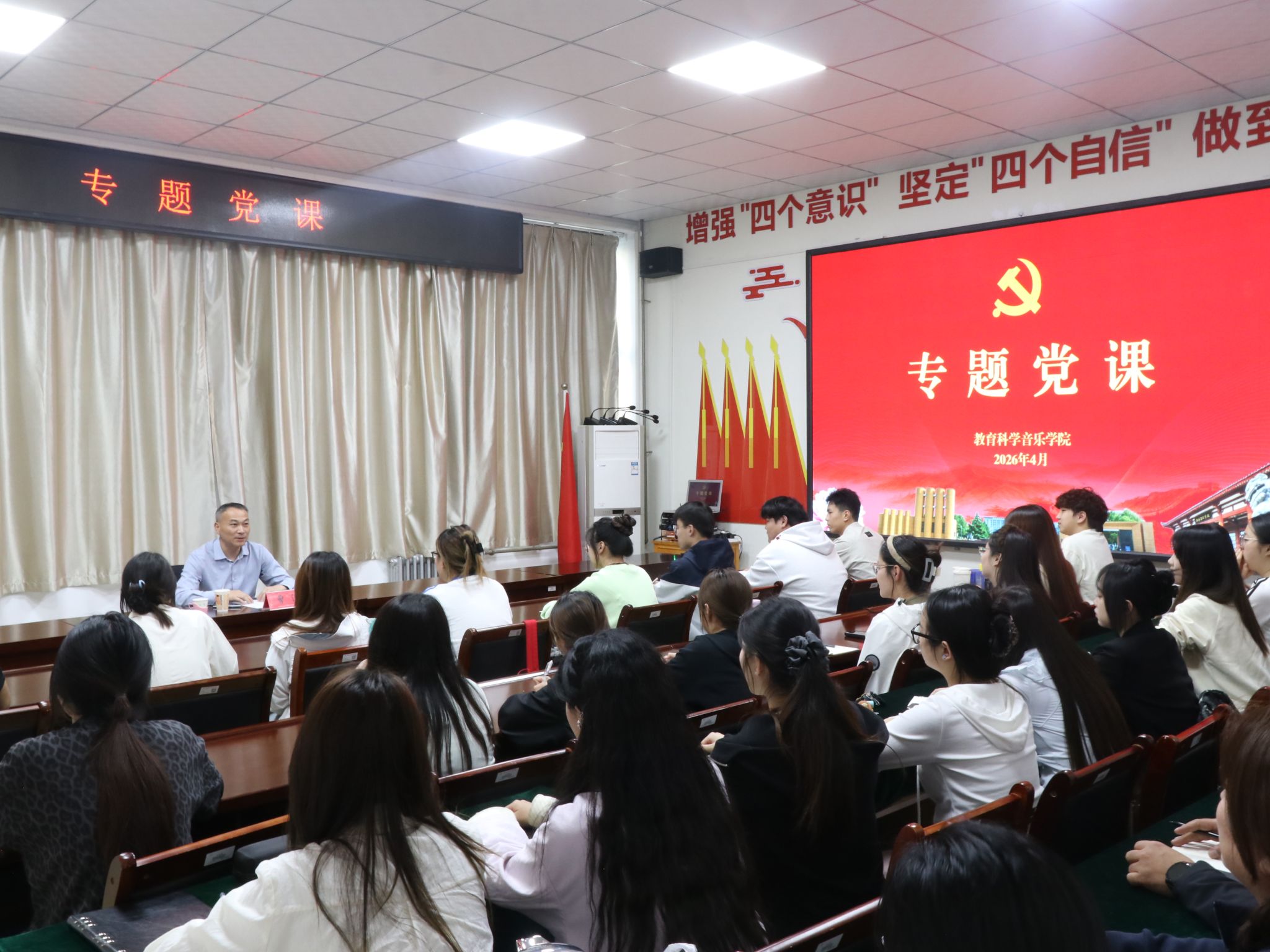 4月16日,洛阳理工学院党委副书记、工会主席曾涛到教育科学与音乐学院XF406讲授专题党课,教育科学与音乐学院各支部书记、学生党员共30余人聆听党课。